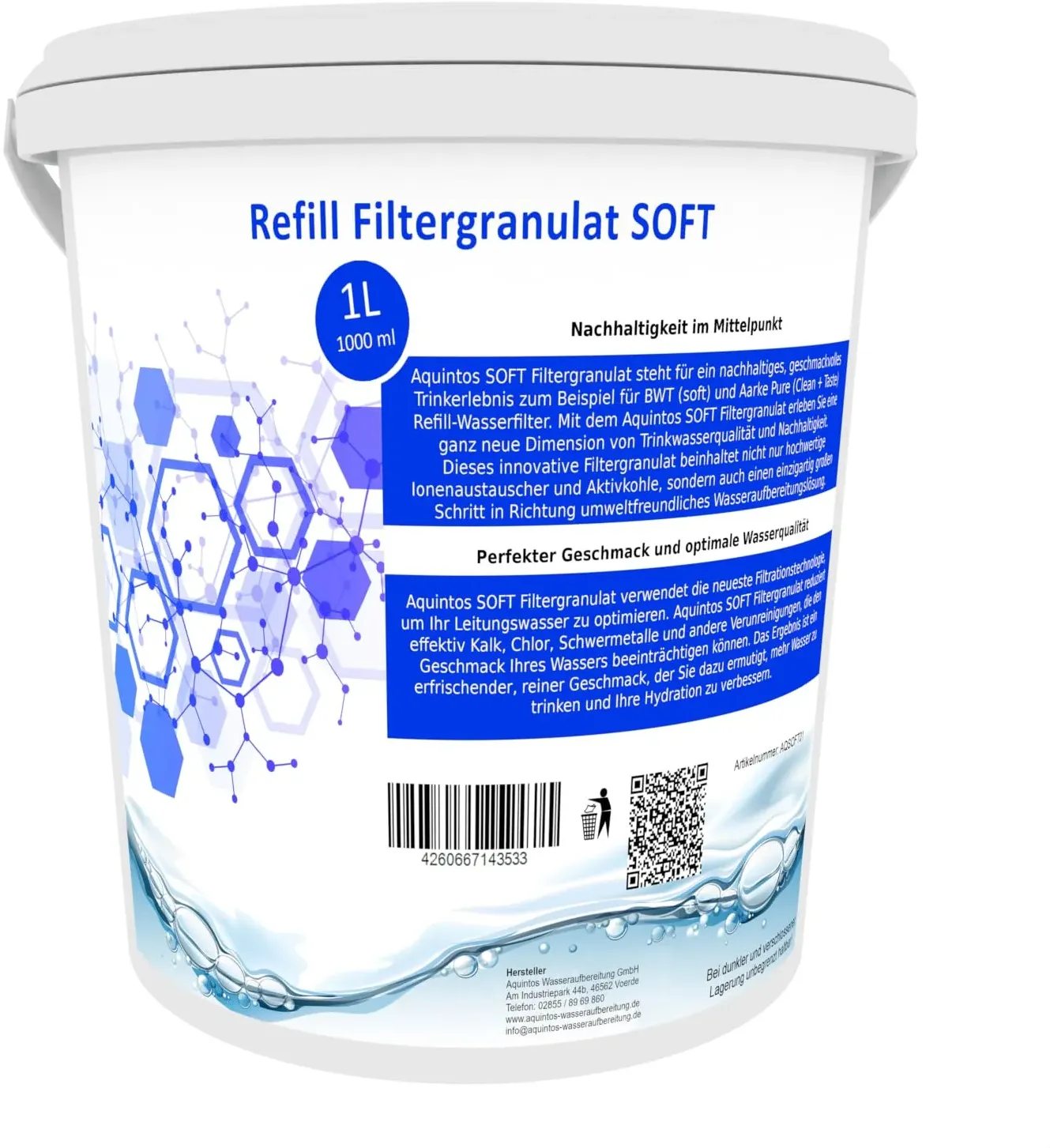 Kategorie: Wasserfilter - Aquintos Wasseraufbereitung - GTIN:4260667143533 - Mit dem Aquintos SOFT Filtergranulat erleben Sie eine ganz neue Dimension von Trinkwasserqualität und Nachhaltigkeit. Dieses innovative Filtergranulat beinhaltet nicht nur hochwertige Ionenaustauscher und Aktivkohle, sondern auch einen einzigartig großen Schritt in Richtung nachhaltiger Wasseraufbereitungslösung. Statt Einwegkartuschen zu verwenden, kaufen Sie nur das Nachfüllgranulat für mindestens 10 - 50 Befüllungen. Das bedeutet nochmal deutlich weniger Verpackungsmüll im Vergleich zu herkömmlichen Wasserfiltern. Aquintos SOFT Filtergranulat verwendet die neueste Filtrationstechnologie, um Ihr Leitungswasser zu optimieren. Aquintos SOFT Filtergranulat reduziert effektiv Kalk, Chlor, Schwermetalle und andere Verunreinigungen, die den Geschmack Ihres Wassers beeinträchtigen können. Das Ergebnis ist ein erfrischender, reiner Geschmack, der Sie dazu ermutigt, mehr Wasser zu trinken und Ihre Hydratation zu verbessern. ANWENDUNG: Einfach die Filterkartusche öffnen, das alte Filtergranulat über den Hausmüll entsorgen, die Kartusche sauber ausspülen und anschließend wieder zu ca. 80% mit Aquintos SOFT Filtergranulat befüllen. Das Restvolumen wird gebildet, sobald das Filtergranulat durch den ersten Wasserdurchlauf aktiviert wurde. (Das Granulat quilt auf und bildet ein entsprechendes Restvolumen). Das am häufigsten kontrollierte Lebensmittel ist das Trinkwasser aus der Leitung, was durch das Aquintos ... Dieses 1-Liter-Filtergranulat von Aquintos ist speziell für Kaffeevollautomaten und Bügelstationen konzipiert und bietet eine gute Leistung für den Preis. ![]() ![]() Aquintos Wasseraufbereitung Filtergranulat für Kaffeevollautomaten & Bügelsationen - Filter Granulat (1 Liter Coffee Clean)