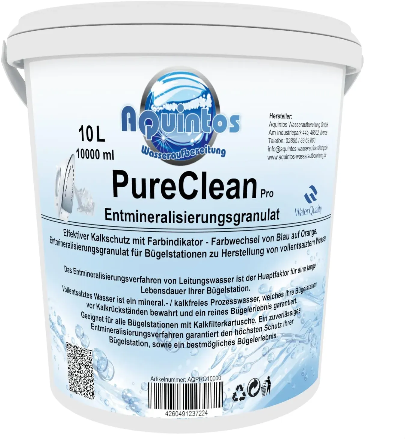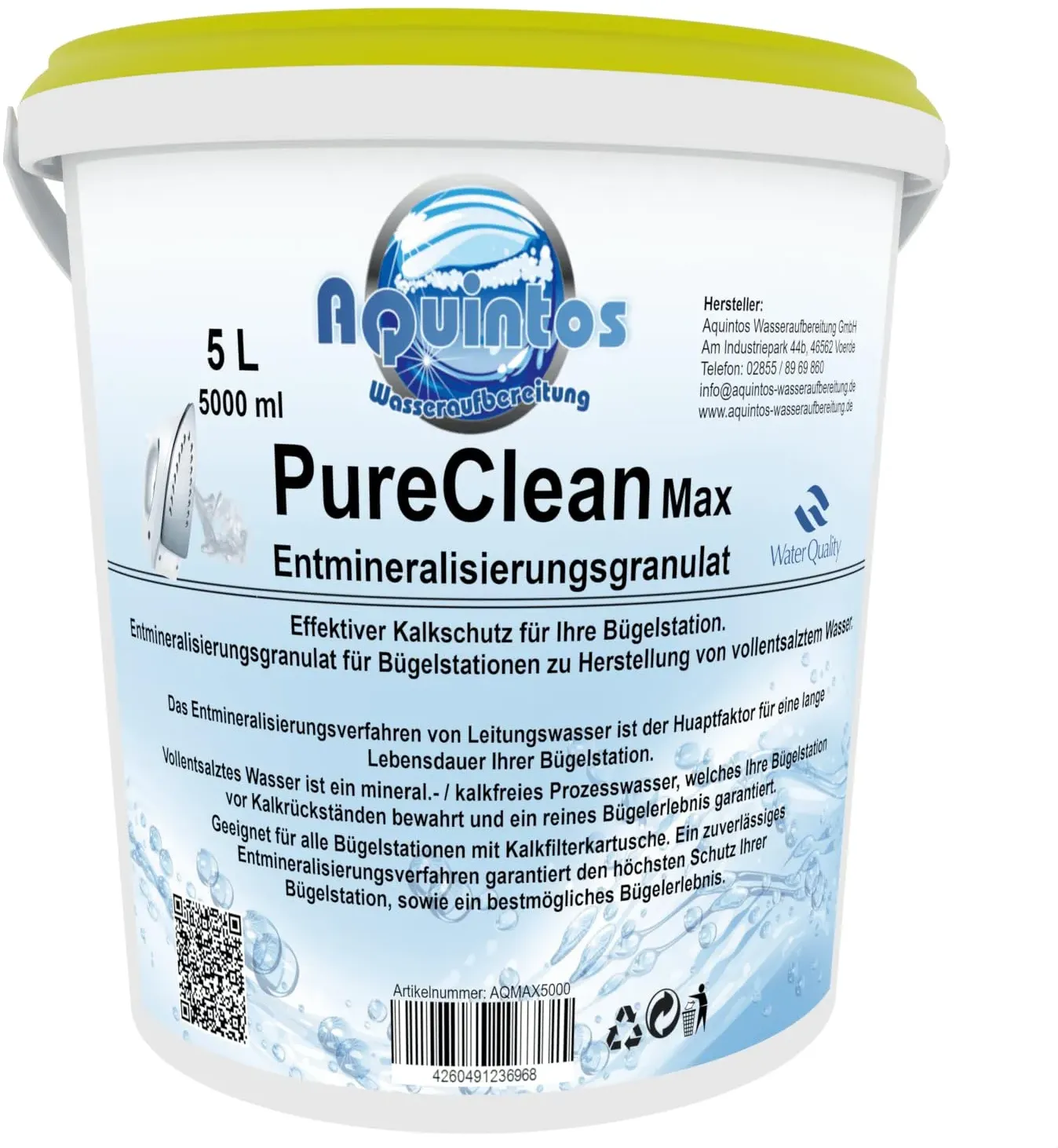 Kategorie: Sonstiges Wasch- & Bügelzubehör - Aquintos Wasseraufbereitung - GTIN:4260491236968 - HOCHWERTIGE QUALITäT: Mit unserem PureClean Max Entmineralisierenden Granulat erhältst Du ein hochwertig verarbeitetes Produkt, dass effektiven Kalkschutz für Deine Bügelstation bietet. Unser Granulat sorgt dafür, dass das Wasser vollentsalzt wird und somit komplett frei von Mineralien und Kalk ist. Dank dem Granulat wird Deine Bügelstation vor Kalkrückständen bewahrt. ERHöHT DIE LEBENSDAUER: Wenn Du unser entmineralisierendes Granulat regelmäßig anwendest, wirst Du die Lebensdauer und die Leistung Deiner Bügelstation erhalten, denn das Entmineralisieren von Leitungswasser ist einer der Hauptgründe um die Lebensdauer Deiner Bügelstation verlängern zu können. ECHTER ALLROUNDER: Unser Granulat eignet sich für alle Bügelstationen die eine Kalkfilterkartusche haben. Das Granulat ermöglicht Dir ein zuverlässiges Entmineralisieren und bietet somit höchsten Schutz für Deine Bügelstation. Durch die Anwendung unseres Granulats wirst Du ein bestmögliches Bügelergebnis erzielen. MADE IN GERMANY: Du bist auf der Suche nach Produkten, die in Deutschland hergestellt wurden und somit Qualität und Sicherheit aufweisen? Dann bist Du bei uns genau richtig, denn unsere Produkte werden alle in Voerde am Niederrhein hergestellt. Deshalb können wir Dir auch das bestmögliche Ergebnis versprechen. Die Wasserqualität kann mit einem Leitwertmessgerät in s/cm oder ppm ermittelt werden. üBER UNS: Aquintos ... Dieses 5-Liter-Mischbettharz von Aquintos ist ein hochwertiges Vollentsalzungsharz zur Herstellung von VE-Wasser. ![]() ![]() Aquintos Wasseraufbereitung Mischbettharz Pure Resin PMB 101-3 Vollentsalzungsharz - Filtergranulat zur Wasservollentsalzung und Herstellung von VE Wasser (5 Liter)