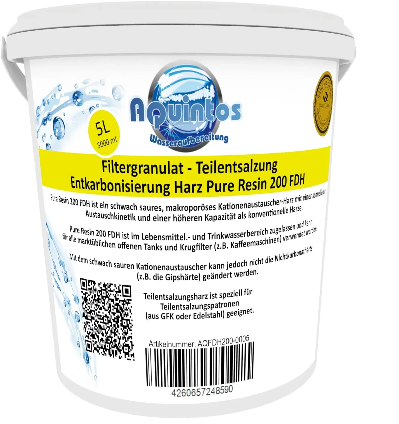 Kategorie: Motorradreifen - Aquintos Wasseraufbereitung - GTIN:4260657248804 - Teilentsalzungsharz Filtergranulat zur Wasser Teilentsalzung / Entkarbonisierung Harz Pure Resin 200 FDH Pure Resin 200 FDH ist ein schwach saures makroporöses Kationenaustauscher-Harz mit einer schnelleren Austauschkinetik und einer höheren Kapazität als konventionelle Harze. Es ist auf Natriumbasis in kugelförmigen Perlen erhältlich und wird zur Teilentsalzung (Entkarbonisierung) eingesetzt. Pure Resin 200 FDH ist im Lebensmittel- und Trinkwasserbereich zugelassen und kann für alle marktüblichen offenen Tanks und Krugfilter (z.B. Kaffeemaschinen) verwendet werden. Mit dem schwach sauren Kationenaustauscher kann jedoch nicht die Nichtkarbonathärte (z.B. die Gipshärte) geändert werden. Teilentsalzungsharz ist speziell für Teilentsalzungspatronen (aus GFK oder Edelstahl) geeignet. Bei der Entkarbonisierung handelt es sich um einen diskontinuierlichen Prozess, da sich mit zunehmender Laufzeit das Ionenaustauscherharz erschöpft. Dieses kann allerdings mit einer speziellen Lösung aus Salzsäure oder Schwefelsäure regeneriert werden. - 54,00 Euro bei Amazon Marketplace Automotive - gefunden von billiger.de Dieses 5L Refill Filtergranulat von Aquintos ist eine größere Packung für den Ersatz von BWT soft und Aarke Pure Clean + Taste SOFT Filtergranulat und bietet ein gutes Preis-Leistungs-Verhältnis für Vielnutzer. ![]() ![]() Aquintos Wasseraufbereitung Refill Filtergranulat Ersatz für BWT soft und Aarke Pure Clean + Taste SOFT Filtergranulat von Aquintos (5L Eimer)