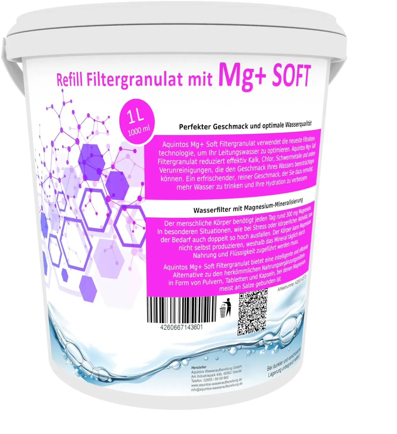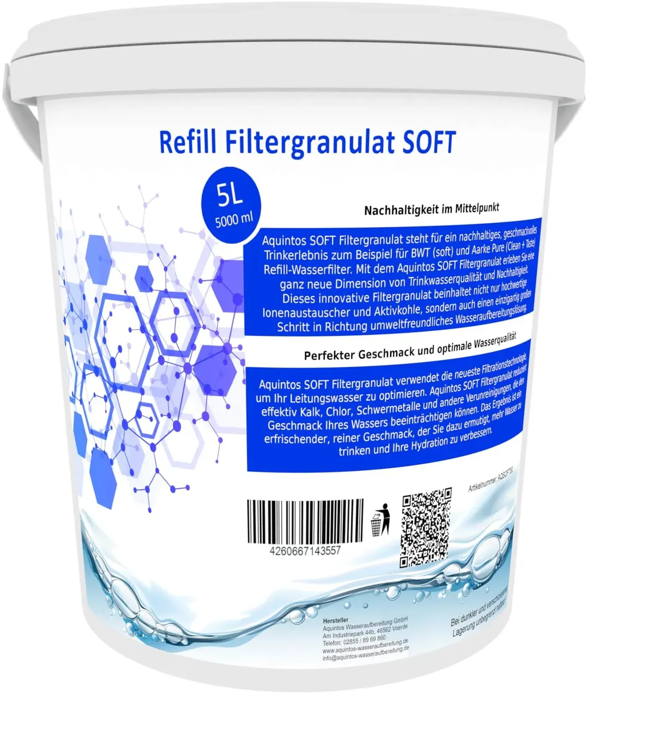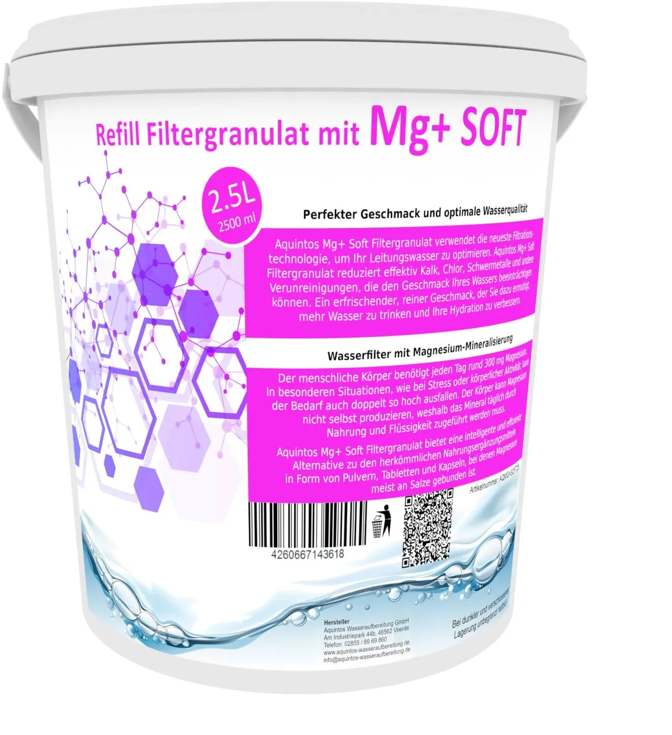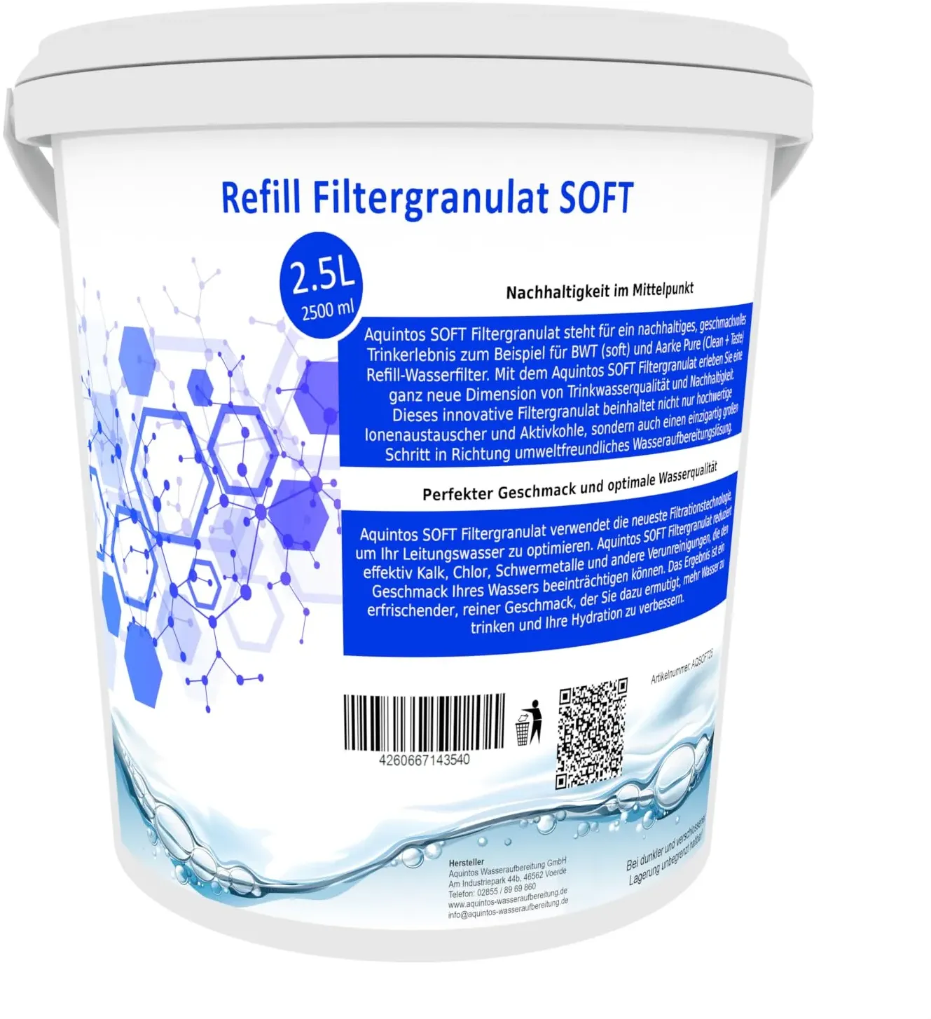 Kategorie: Wasserfilter - Aquintos Wasseraufbereitung - GTIN:4260667143601 - Aquintos Mg+ Soft Filtergranulat steht für ein nachhaltiges, geschmackvolles Trinkerlebnis zum Beispiel für BWT (Magnesium Mineralized Water) und Aarke Purifier (Enriched) ReFill-Wasserfilter. Mit dem Aquintos Mg+ Soft Filtergranulat erleben Sie eine ganz neue Dimension von Trinkwasserqualität und Nachhaltigkeit. Statt Einwegkartuschen zu verwenden, kaufen Sie nur das Nachfüllgranulat für mindestens 10 - 50 Befüllungen. Das bedeutet nochmal deutlich weniger Verpackungsmüll im Vergleich zu herkömmlichen Wasserfiltern. Aquintos Mg+SOFT Filtergranulat verwendet die neueste Filtrationstechnologie, um Ihr Leitungswasser zu optimieren. Aquintos SOFT Filtergranulat reduziert effektiv Kalk, Chlor, Schwermetalle und andere Verunreinigungen, die den Geschmack Ihres Wassers beeinträchtigen können. Das Ergebnis ist ein erfrischender, reiner Geschmack, der Sie dazu ermutigt, mehr Wasser zu trinken und Ihre Hydratation zu verbessern. ANWENDUNG: Einfach die Filterkartusche öffnen, das alte Filtergranulat über den Hausmüll entsorgen, die Kartusche sauber ausspülen und anschließend wieder zu ca. 80% mit Aquintos SOFT Filtergranulat befüllen. Das Restvolumen wird gebildet, sobald das Filtergranulat durch den ersten Wasserdurchlauf aktiviert wurde. (Das Granulat quilt auf und bildet ein entsprechendes Restvolumen). Das am häufigsten kontrollierte Lebensmittel ist das Trinkwasser aus der Leitung, was durch das ... Dieses 2,5L Refill Filtergranulat von Aquintos ist eine gängige Option als Ersatz für BWT soft und Aarke Pure Clean + Taste SOFT Filtergranulat. ![]() ![]() Aquintos Wasseraufbereitung Refill Filtergranulat Ersatz für BWT soft und Aarke Pure Clean + Taste SOFT Filtergranulat von Aquintos (2,5L Eimer)