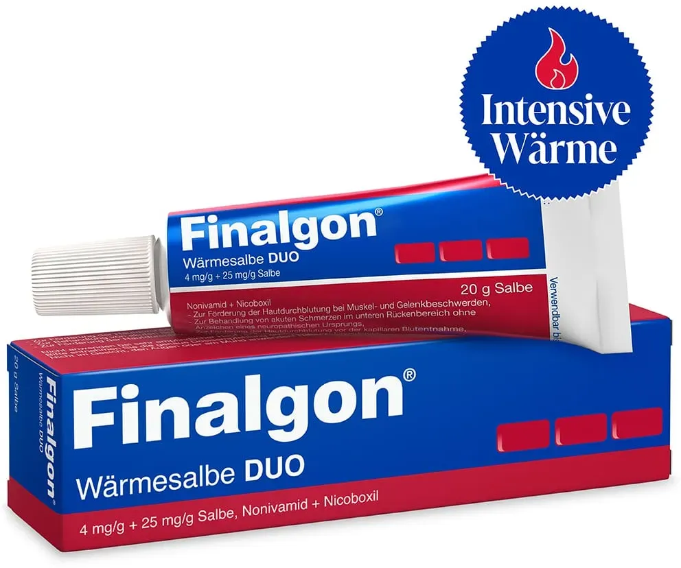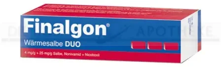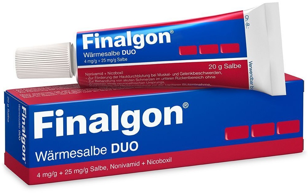 Zentiva Pharma - Finalgon Wärmesalbe DUO 4 mg/g + 25 mg/g, 20 g - bei claras-apotheke.de - aus Yadore Produktdaten Ein gutes Angebot von aponeo.de, das preislich im mittleren Bereich liegt. ![]() ![]() Finalgon Wärmesalbe DUO Inhalt: 20 g