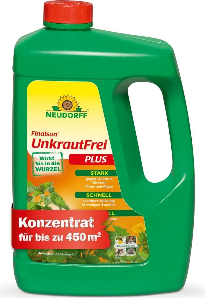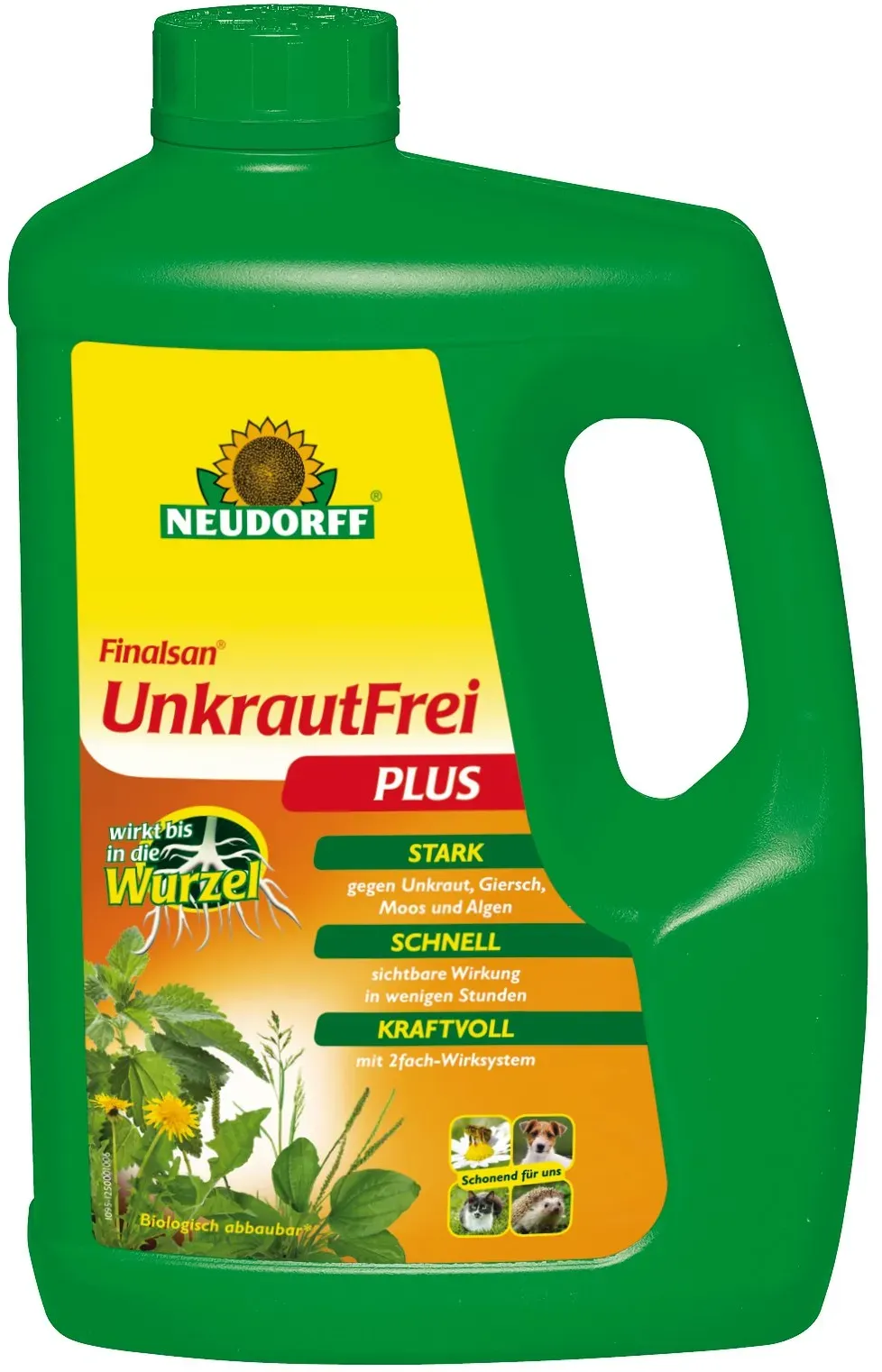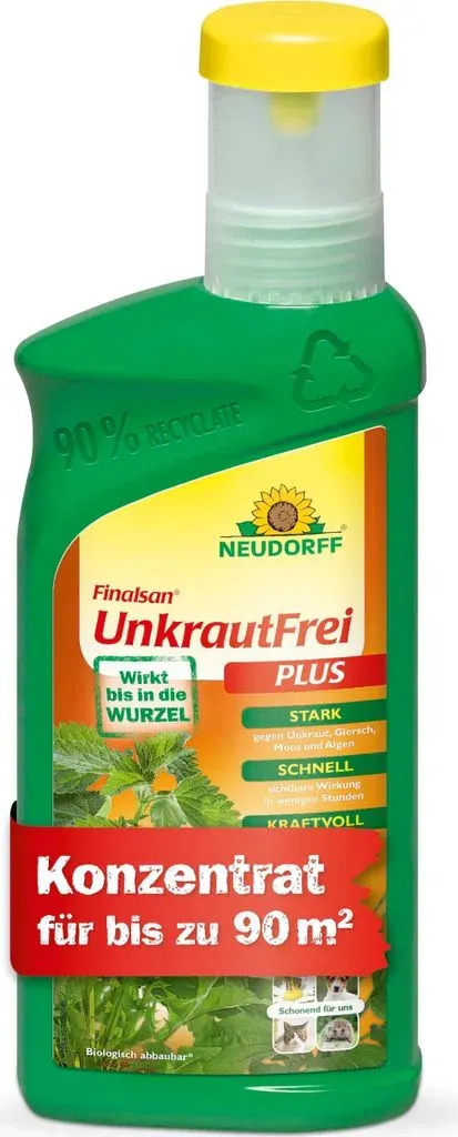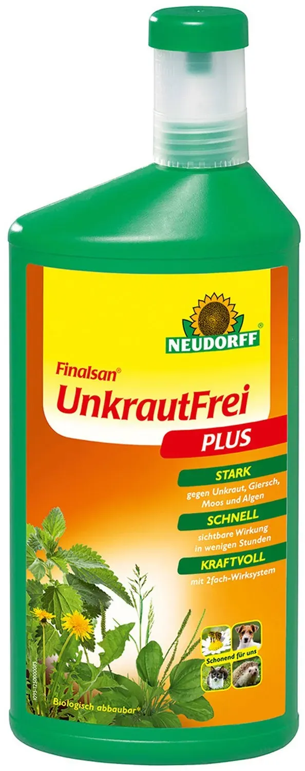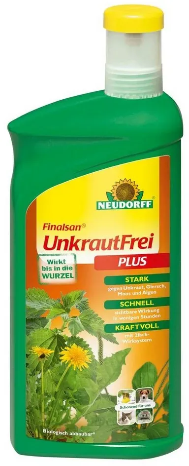 Kategorie: Pflanzendünger - NEUDORFF - GTIN:4005240004968 - Kraftvoller Unkrautvernichter: Beseitigt schnell und wochenlang Unkräuter und Gräser, auch Problemunkräuter wie Ackerschachtelhalm, Giersch, Moos und Algen ohne Glyphosat!2fach-Wirkung: Natürliche Fettsäure zerstört Zellwände der Pflanzen für Sofortwirkung. Wachstumsregulator stoppt Zellteilung und verhindert wochenlang NeuaustriebWirkt bis in die Wurzel: Herbizid wirkt auf grüne Pflanzen bis in die Wurzel und ist auch bei niedrigen Temperaturen wirksam. Für Moosentferner empfehlen wir Finalsan RasenMoosfreiEinfache Anwendung: Entferner mit Wasser verdünnen, Unkraut besprühen, bis es braun wird und abstirbt. Besonders wirksam bei einer Unkrauthöhe von 5-10 cmUmweltfreundliches Unkrautmittel: Biologisch abbaubar, schonend für Bienen, Haustiere und Igel. Behandelte Flächen können nach dem Antrocknen sofort wieder benutzt werden Der Geruch von Finalsan UnkrautFrei Plus ist wirkstoffspezifisch und nach kurzer Zeit nicht mehr wahrnehmbar. **Wirkungsspektrum:** Finalsan UnkrautFrei Plus wirkt gegen viele wichtige Unkräuter wie z.B. Löwenzahn, Wegerich-Arten, Gräser, Giersch, Ackerschachtelhalm, Vogelmiere, Brennnessel und Distel. Die Wirkung ist bereits nach einem Tag sichtbar. Außerdem werden Moose und Algen bekämpft. Das Mittel besitzt keine nachhaltige Wirkung. **Nicht zur Beseitigung von Unkräutern und Moos in Rasenflächen geeignet, da alle grünen Pflanzenteile abgetötet werden.** **Neupflanzung nach Anwendung von ... Das 750 ml anwendungsfertige Spray von billiger.de ist ideal für die direkte Anwendung ohne Mischen und bietet ein gutes Preis-Leistungs-Verhältnis. ![]() ![]() NEUDORFF Finalsan AF UnkrautFrei Plus 750 ml