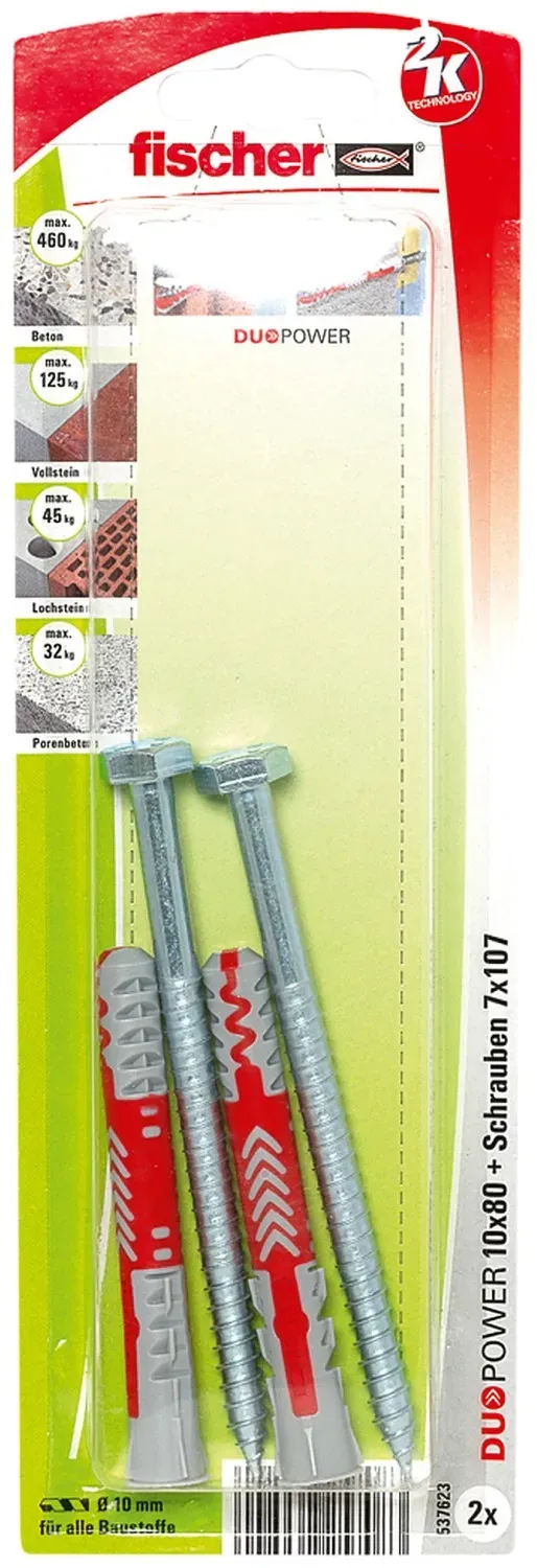4 Händlerangebote bei billiger.de - Kategorie: Eisenwaren - Fischer - Der Fischer Dübel DuoPower bietet sehr gute Haltewerte durch zwei Komponenten: Die graue Komponente aus hochwertigem Nylon aktiviert je nach Baustoff automatisch das optimale Funktionsprinzip (Spreizen, Klappen, Knoten) für besten Halt. Die Expansionsflügel der roten Komponente unterstützen die sichere Verspreizung und bieten zusätzliche Sicherheit zur grauen Komponente. Einfaches Eindrehen der Schraube und richtiges Ziehen zum Schluss. Kein überdrehen der Schraube. Der am Dübelkopf angeformten Rand verhindert, dass der Dübel ins Bohrloch rutscht. Die mitgelieferten Schrauben sind optimal auf den Fischer Spreizdübel DuoPower abgestimmt. - GTIN:4048962257083 Ein sehr preiswertes Angebot für 2 Dübel mit Schrauben. ![]() ![]() Fischer DuoPower 10x80 S K (2)