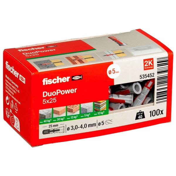 0,03 € / 1 Stück - Baustoffe und Installationsmaterial Befestigung Dübel Schmiedestücke & Hardware - EAN:4048962235555 - Der fischer DUOPOWER ist ein aus zwei Komponenten bestehender Allzweckdübel und zeichnet sich durch seine guten Haltewerte aus. Die graue Komponente aus Polyamid aktiviert je nach Baustoff automatisch die passende Funktion (Spreizen, Klappen, Knoten) für den besten Halt. Die rote Komponente unterstützt die sichere Verspreizung und gibt der grauen Komponente zusätzliche Sicherheit. Der am Dübelkopf angeformte Rand verhindert, dass der Dübel in das Bohrloch rutscht. Einsatzgebiete: zur Anbringung von leichten Gegenständen wie Sockelleisten, Kabelkanälen, Bildern, Dekorationen, Seifenschalen oder Toilettenpapierhaltern in zahlreichen Baustoffen wie Beton, Voll- und Hochlochziegeln, Naturstein, Kalksand-Voll- und Lochstein, Gipskarton, Gipsbau und -faserplatten, Hohldecken und Spanplatten Eigenschaften: Bohrernenndurchmesser 5 mm Dübellänge 25 mm für Schrauben mit Ø 3 - 4 mm verwendbar 2-komponentig 100 Stück im Pack - gefunden von Kelkoo Dieses Angebot für 5x25 LD Dübel ist mit 4.39 Euro sehr günstig und eignet sich für kleinere, leichte Befestigungen. Contorion. de fischer Dübel DuoPower 5x25 LD (535452)
