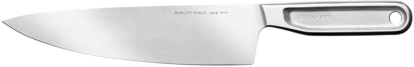 3 Händlerangebote bei billiger.de - Kategorie: Küchenmesser - Fiskars - Leistungsstarkes, in Finnland entworfenes großes All Steel Kochmesser für die meisten Schneidaufgaben in der Küche, Klingenlänge: 32,5 cm Gegossenes Messer mit einer nahtlosen, rostfreien Struktur, Optimale Balance für ein erstklassiges Schneideerlebnis Scharfe Klinge mit hoher Schnitthaltigkeit, Schärfen mit separat erhältlichem Fiskars Roll-Sharp (Art.-Nr. 1065598) oder Wetzstein empfohlen Hergestellt aus japanischem Aichi-Hartstahl mit einer Härte von 58 HRC für hervorragende Leistung und Haltbarkeit, Spülen von Hand und sorgfältige Aufbewahrung empfohlen Lieferumfang: 1x Fiskars Kochmesser, Groß, Gesamtlänge: 32,5 cm, Klingenlänge: 20 cm, Material: Japanischer Aichi-Hartstahl, All Steel, 1062882 - GTIN:6424002014270 Das Norden Kochmesser in kleiner Größe ist eine Premium-Option mit hochwertigen Materialien und ansprechendem Design. ![]() ![]() Fiskars Kochmesser Norden Klein 21,7 cm braun