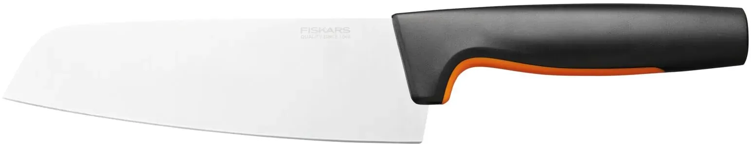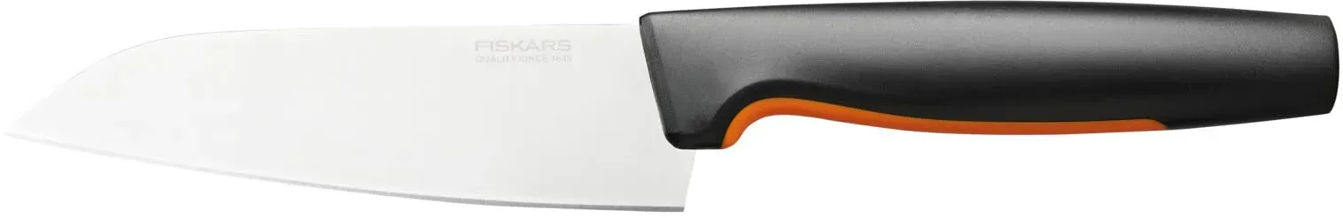 Zustand: Neu - Kochmesser - Fiskars - 1057536 - EAN: 6424002012818 - Santoku Küchenmesser mit breiter Klinge (Klingenlänge: 16 cm) für Profis und Hobbyköche zur Zubereitung von Fleisch, Fisch und Gemüse, Optimal geeignet für Rechts- und Linkshänder sowie für unterschiedlich große Hände Angenehme Griffigkeit dank ergonomisch geformtem Griff aus hochwertigem Kunststoff, Sicherer Halt dank Softtouch Material an der Griffunterseite Hohe Schneidkraft dank scharfer Klinge aus rostfreiem, japanischem Stahl, Hohe Sicherheit dank des praktischen Fingerschutzes Hohe Langlebigkeit, Leichtes Reinigen, Spülmaschinengeeignet, Empfohlenes Spülen von Hand für langanhaltende Schärfe, Finnisches Design Lieferumfang: 1x Fiskars Functional Form Santoku Kochmesser, Klingenlänge: 16 cm, Gesamtlänge: 29 cm, Gewicht: 110 Gramm, Material: Japanischer Edelstahl/Kunststoff, Farbe: Silber/Schwarz/Orange, 1057536 - 17 Händler im amazon.de Marketplace Dieses große Functional Form Kochmesser ist eine solide Wahl für umfassende Schneidarbeiten zu einem attraktiven Preis. ![]() ![]()