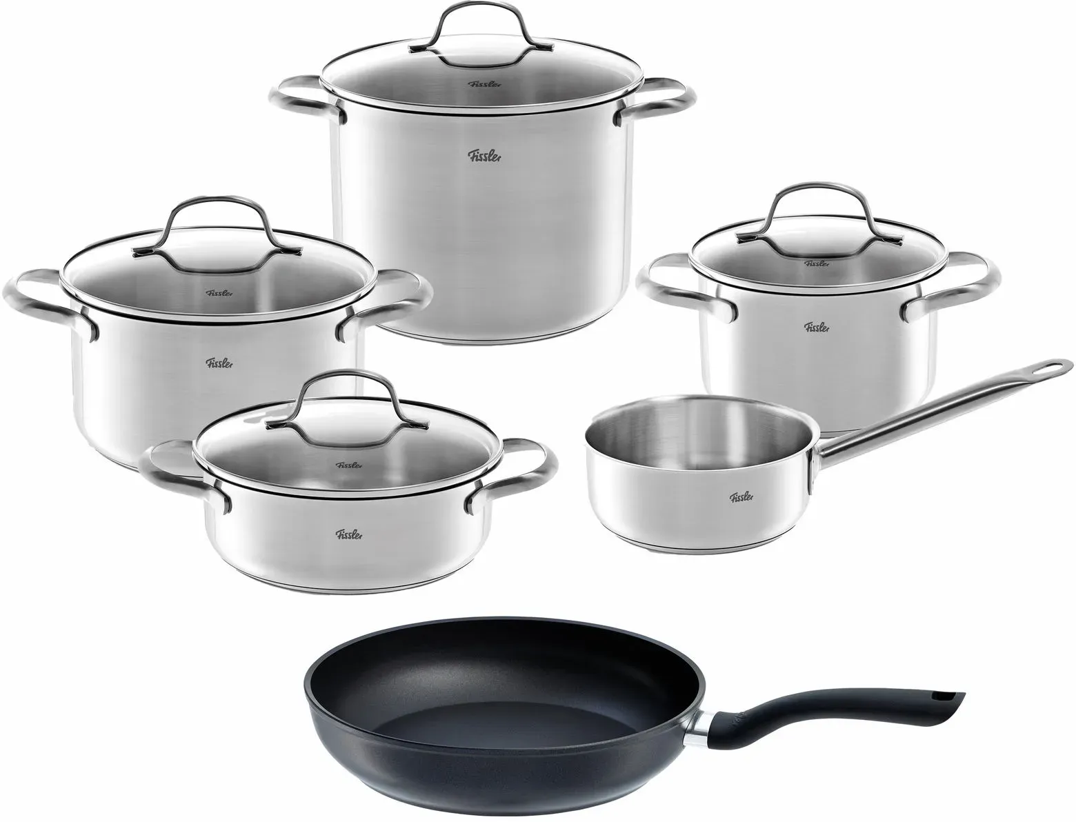 Auf Lager Versand durch AmazonFissler San Francisco/Edelstahl-Topfset, 5-teilig, Kochtopf-Set, Töpfe mit Glas-Deckel, Induktion (3 Kochtöpfe,1 Bratentopf 1 Stielkasserolle) ? Induktion