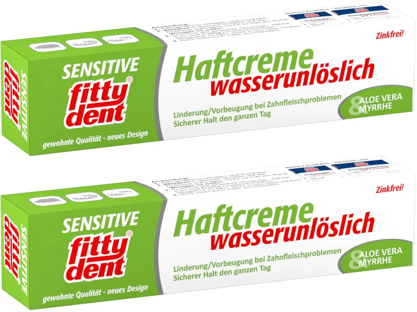 Kategorie: Zahnpflegeartikel - FITTY-DENT - GTIN:0659436125377 - PREMIUM: Das Spezialprodukt für Ober- und Unterkieferprothesen Träger - kein Verrutschen oder Verschieben der Prothese | Geschmacksneutral - Ohne Farb- und Aromastoffe | zinkfrei SICHERER UND FESTER HALT: Die Super Haftcreme bieten dem Träger von Ober- und Unterkieferprothesen einen rt sicheren und festen Halt | Hält den ganzen Tag mit nur einmal auftragen WASSERUNLöSLICH: Die einzige wasserunlösliche Haftcreme auf dem Markt | Kein Ausspülen beim Essen, Trinken oder hoher Speichelproduktion 1 x TäGLICH: Klebt am Gaumen anstatt nur zu haften wir herkömmliche Haftmittel. Bitte berücksichtigen Sie bei erstmaliger Anwendung, dass bei fittydent, anders als bei anderen Haftcremes weniger Haftcreme mehr Haftkraft bedeutet ! QUALITäT: Medizinprodukt | fittydent super Haftcreme ist deutschen Apotheken & Drogeriemärkten erhältlich - 13,99 Euro bei Amazon Marketplace Automotive - gefunden von billiger.de Dieses 2er-Pack der sensitiven Variante ist ideal für Nutzer mit empfindlichem Zahnfleisch. ![]() ![]() FITTY-DENT 2 x FITTYDENT super sensitive Haftcreme 40 g Paste - Die sanfte Haftcreme die einzig wasserunlösliche Haftcreme mit Aloe Vera & Myrrhe