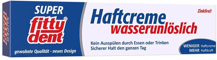 Zustand: Neu - 198,75 € / kg - Haftmittel Zahnprothesen-Haftmittel - FITTY-DENT Fittydent - 02170104 02171042 - EAN: 0659436125384 - PREMIUM: Das Spezialprodukt für Ober- und Unterkieferprothesen Träger - kein Verrutschen oder Verschieben der Prothese | Geschmacksneutral - Ohne Farb- und Aromastoffe | zinkfrei SICHERER UND FESTER HALT: Die Super Haftcreme bieten dem Träger von Ober- und Unterkieferprothesen einen rt sicheren und festen Halt | Hält den ganzen Tag mit nur einmal auftragen WASSERUNLÖSLICH: Die einzige wasserunlösliche Haftcreme auf dem Markt | Kein Ausspülen beim Essen, Trinken oder hoher Speichelproduktion 1 x TÄGLICH: Klebt am Gaumen anstatt nur zu haften wir herkömmliche Haftmittel. Bitte berücksichtigen Sie bei erstmaliger Anwendung, dass bei fittydent, anders als bei anderen Haftcremes weniger Haftcreme - mehr Haftkraft bedeutet! QUALITÄT: Medizinprodukt | fittydent super Haftcreme ist deutschen Apotheken & Drogeriemärkten erhältlich - 10 Händler im amazon.de Marketplace Dieses Angebot ist eine gute Option für diejenigen, die eine einzelne Tube mit starkem Halt suchen. ![]() ![]() FITTY-DENT FITTYDENT super Haftcreme 40 g Paste - Langer Halt & starke Haftkraft. Speziell für schmale und flache Unterkiefer