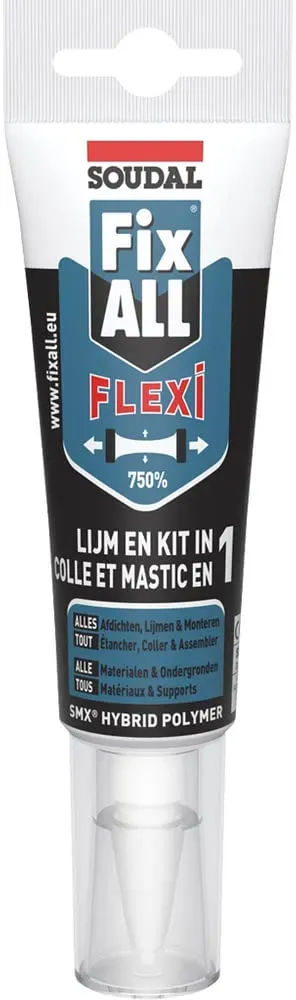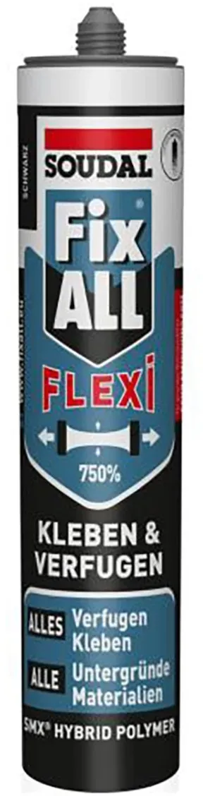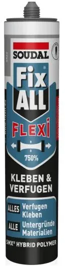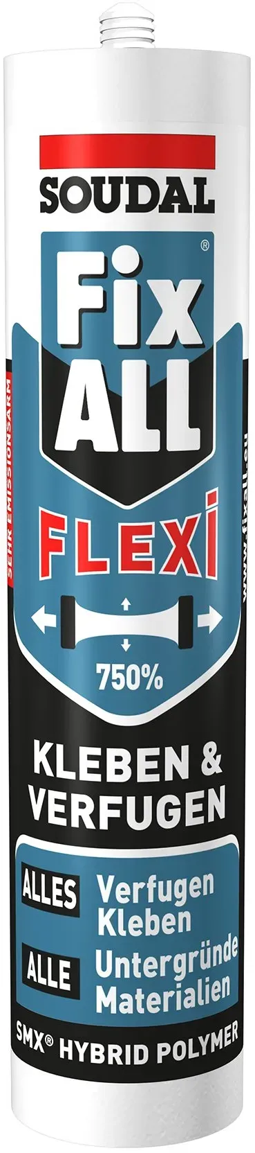 27.64 /kg - Kategorie: Baumaterial - SOUDAL - GTIN:5411183005624 - Soudal Fix All Flexi ist ein Kraftkleber auf MS Polymerbasis für Verklebungen und Verfugung von Stein, Holz, Styropor, diversen Metallen sowie Hart-PVC. Er ist vielfältig einsetzbar. - 12,99 Euro bei OBI - gefunden von billiger.de Für 14.80 Euro erhalten Sie hier eine 290ml Kartusche in Beige, eine gute Option für farblich abgestimmte Arbeiten. ![]() ![]() Soudal Fix ALL Flexi, für alle Anwendungen im Bereich Kleben und Verfugen, Kartusche: 290ml, Farbe: Beige