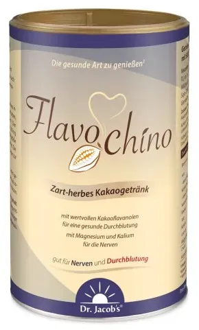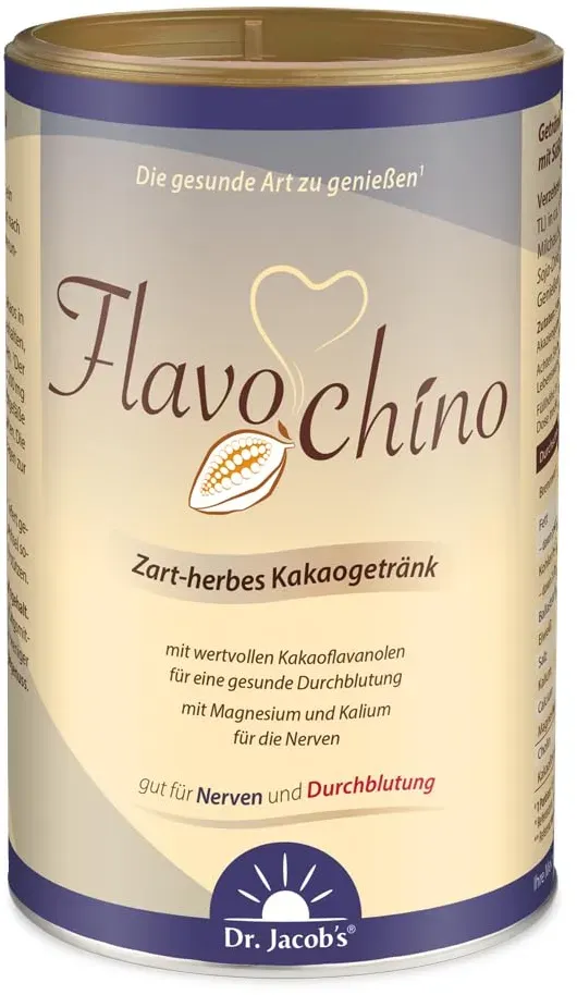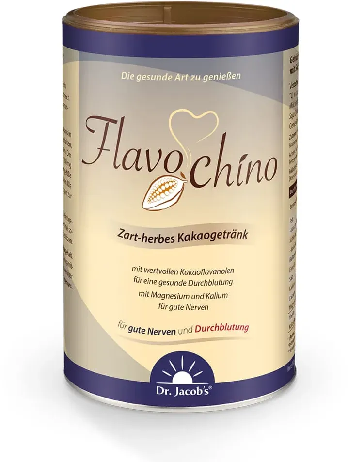 Dr. Jacob's Medical GmbH - EAN: 4041246500318 - Flavochino zart-herber Kakao FlavanoleZart-herbes Kakaogetränk mit gesunden Kakaoflavanolen*Kakaoflavanole für die gesunde DurchblutungMit den Mineralstoffen Kalium und Magnesium für gute NervenHoher Gehalt an Proteinen und Ballaststoffen, veganMit Süßungsmittel Xylit, ohne Zuckerzusatz, weniger süß450 g (ca. 30 Portionen)Bioaktive Kakaoflavanole für die DurchblutungFür die gesundheitsförderliche Wirkung eines Kakaoprodukts ist der Gehalt an Kakaoflavanolen entscheidend. Bis zu 98 % des Flavanolgehalts gehen jedoch bei der herkömmlichen Kakaoverarbeitung verloren.Der Kakao in Dr. Jacob s Flavochino wird besonders schonend verarbeitet. Die wertvollen Kakaoflavanole bleiben so erhalten. *Mit dem täglichen Genuss von einer Portion Flavochino erhalten Sie über 200 mg bioaktive Kakaoflavanole, die helfen, die Elastizität der Blutgefäße und somit die normale Durchblutung aufrechtzuerhalten.1 Portion Flavochino (15 g) liefert 1092 mg Gesamtpolyphenole (als Catechin-äquivalent), davon sind 255 mg bioaktive Kakaoflavanole. - bei medpex.de - aus Yadore Produktdaten ![]() ![]() Dr. Jacob?s Flavochino 450 g Dose I zart-herbes Kakaogetränk I mit Kakaoflavanolen für eine gesunde Durchblutung¹ I mit Mineralstoffen für Nerven² und Blutdruck³ I ohne Zuckerzusatz