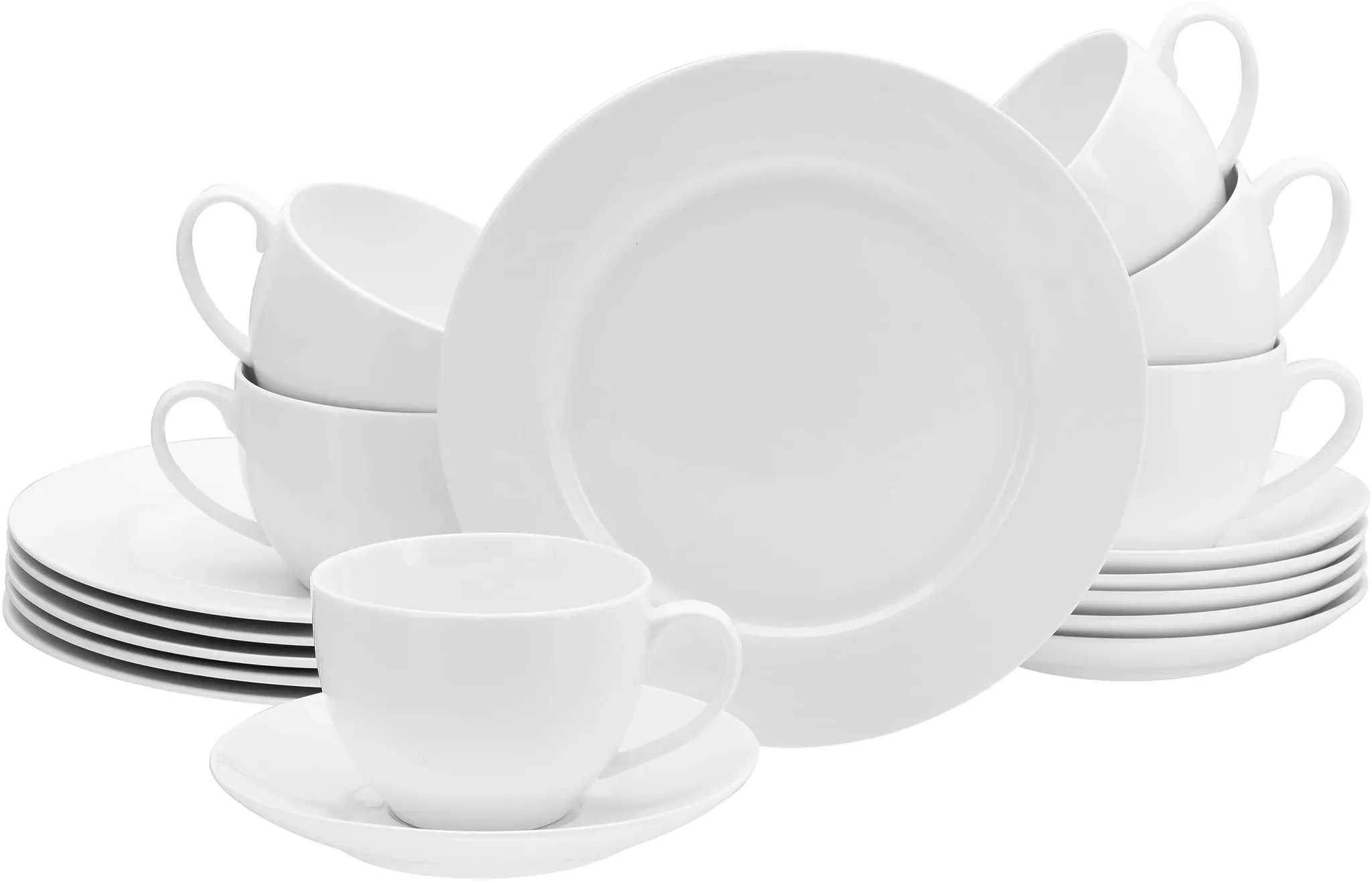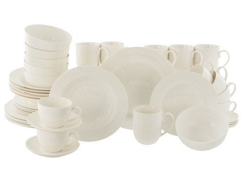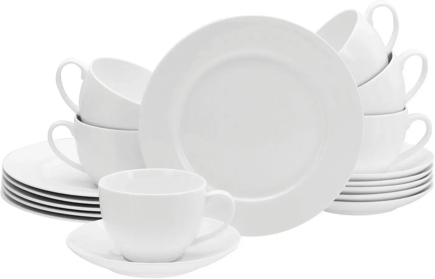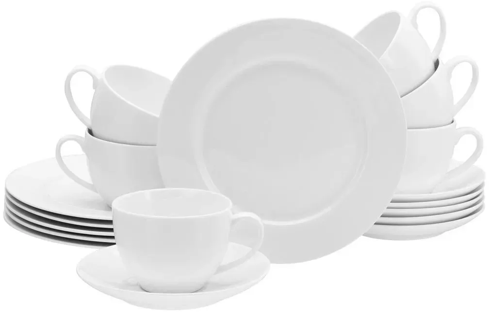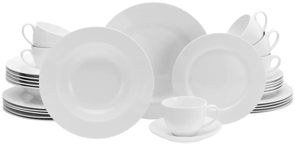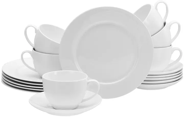 Zustand: Neu - Kombiservice - Creatable CreaTable - 22159 - EAN: 4045486221590 - œ KOMPLETTSET: Das 42-teilige Kombiservice beinhaltet 6 Speiseteller 27 cm, 6 Suppenteller 23 cm, 6 Dessertteller 20,5 cm, 6 Obertassen 20 cl, 6 Kaffeeuntere 15 cm, 6 Kaffeebecher 38 cl und 6 Müslischalen 14,5 cm. œ KLASSIKER IN WEISS: Hochwertiges, cremeweißes Geschirr in traditioneller Fahnenform. Weiß geht immer! œ FÜHLT SICH GUT AN: Extrem dünn, leicht und lichtdurchlässig mit einem eleganten Scherben. Und dazu noch vegan durch die Art der verwendeten Rohstoffe. œ NACHHALTIGE FREUDE: Das Geschirrset begleitet Dich durch den ganzen Tag- ob Frühstück, Lunch, Dinner oder Snack. Es ist außergewöhnlich lang haltbar, stapelbar und selbstverständlich auch spülmaschinen- und mikrowellengeeignet. œ MARKENQUALITÄT: Unser Geschirr wird in Deutschland konzipiert und in ausgewählten Premiumfabriken produziert, um Dir die Qualität zu liefern, die Du Dir für Dein Heim wünschst. Außerdem ist für Bruchersatz in der Regel zeitnah und jahrelang gesorgt! - bei Amazon.de Ein umfangreiches 42-teiliges Kombiservice, das alle Bedürfnisse für eine festliche Tafel abdeckt. ![]() ![]() CreaTable Kombiservice Fleur Royal, Kombi-Service 42-tlg (42-tlg), 6 Personen, Porzellan, Traditionelle Fahnenform weiß