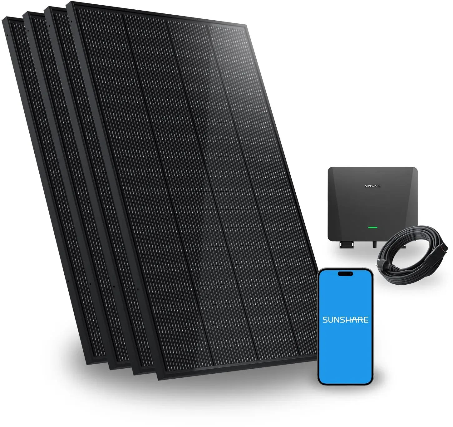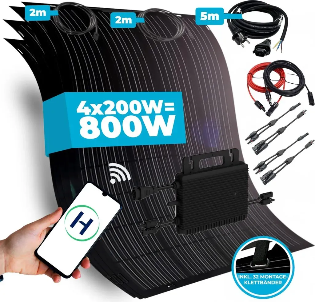 Gewöhnlich versandfertig in 3 bis 4 TagenSUNSHARE Ray 800W Balkonkraftwerk ohne Halterung Flexibles DIY Solaranlage Komplettset 800W Wechselrichter + 4x 200W Solarpanel Plug & Play Balkonkraftwerk 800W Steckdose inkl. Kabel