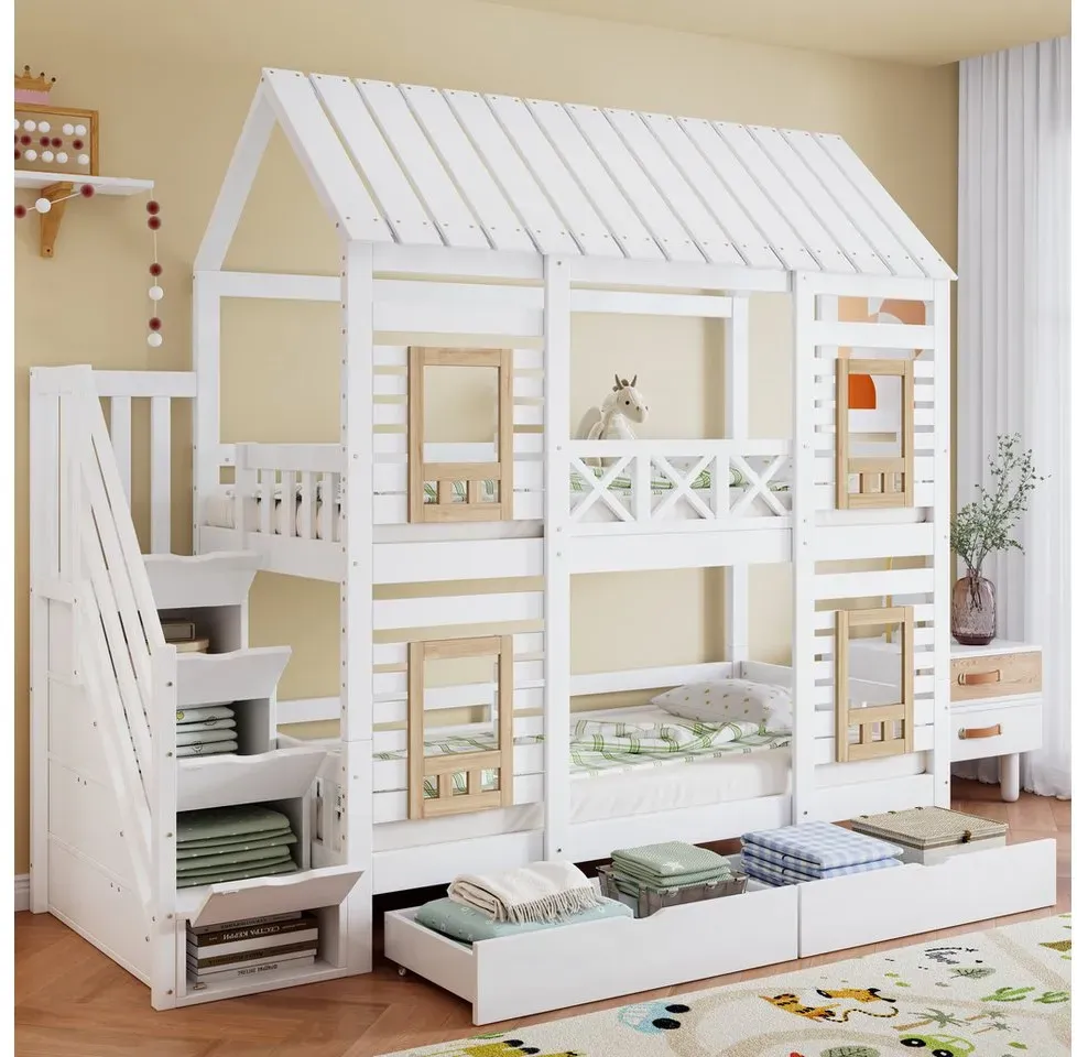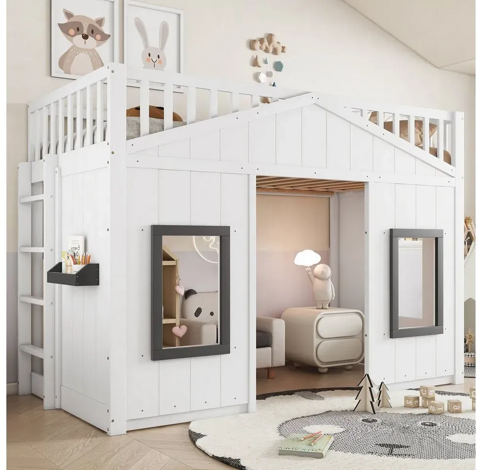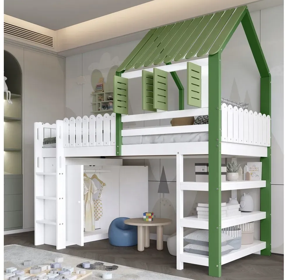 lieferbar-in 5-6 Werktagen bei dirFlieks Hochbett Kinderbett Hausbett 90x200cm mit Kleiderschrank und Stauraumregal weiß