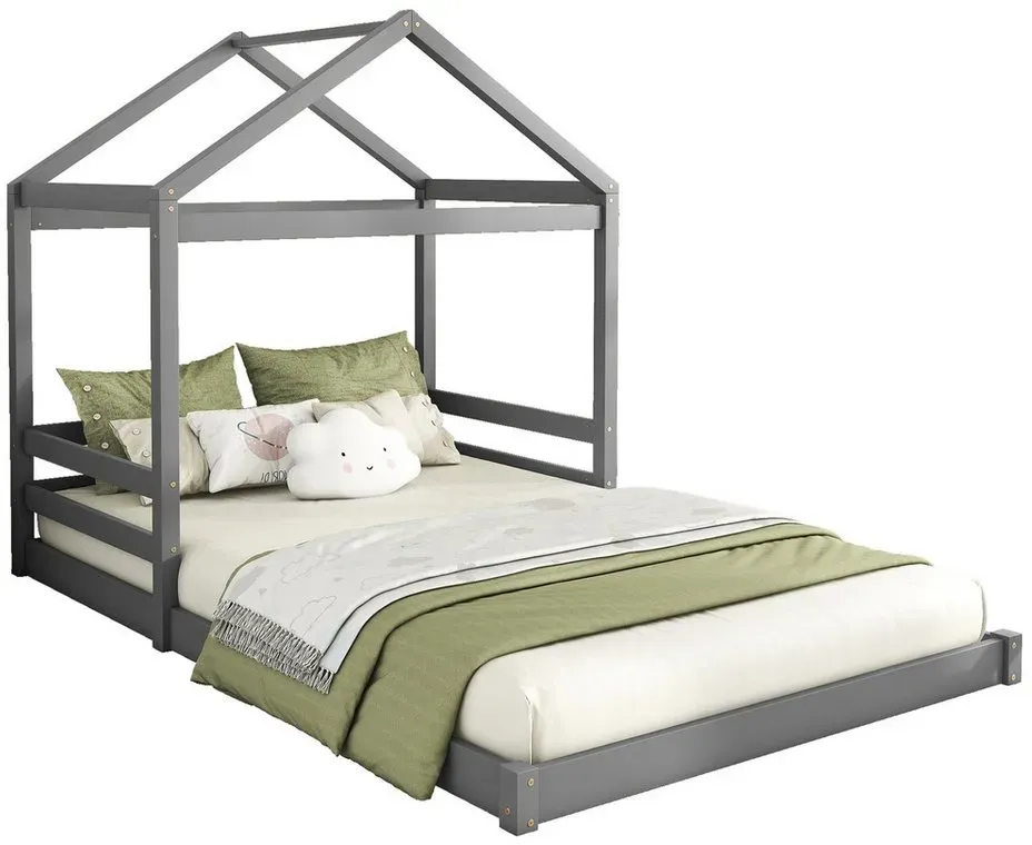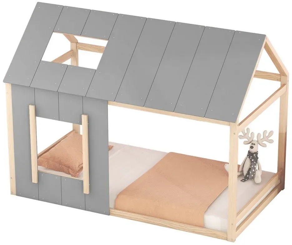 lieferbar-in 5-6 Werktagen bei dirFlieks Kinderbett, Massivholzbett Hausbett Doppelbett 140x200cm mit Lattenrost grau