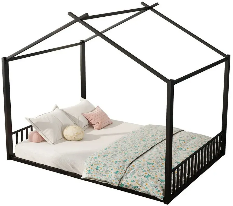 lieferbar-in 4-5 Werktagen bei dirFlieks Metallbett, Doppelbett Hausbett Kinderbett 140x200cm mit Lattenrost schwarz 147 cm x 205 cm x 165 cm