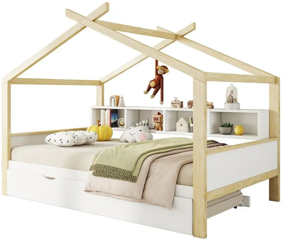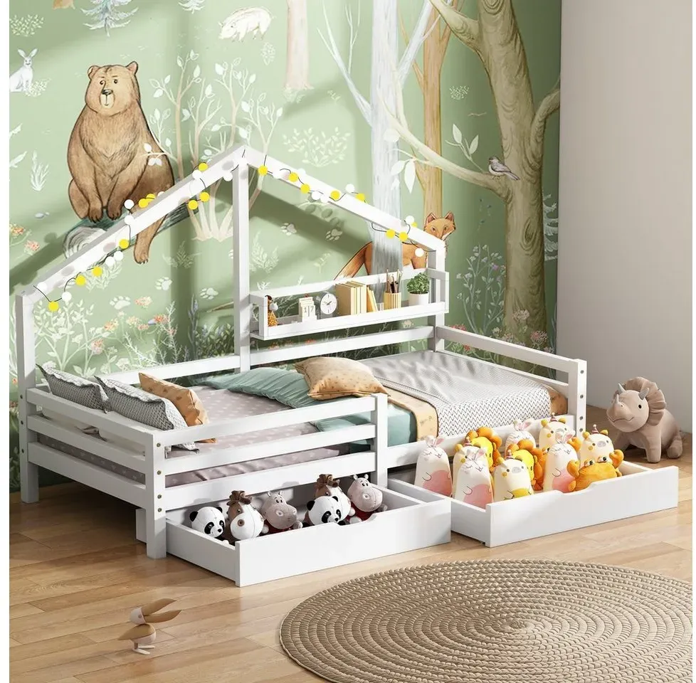 lieferbar-in 4-5 Werktagen bei dirFlieks Kinderbett, Holzbett Hausbett 140x200cm mit Ausziehbett 90x180cm und Staufächer beige