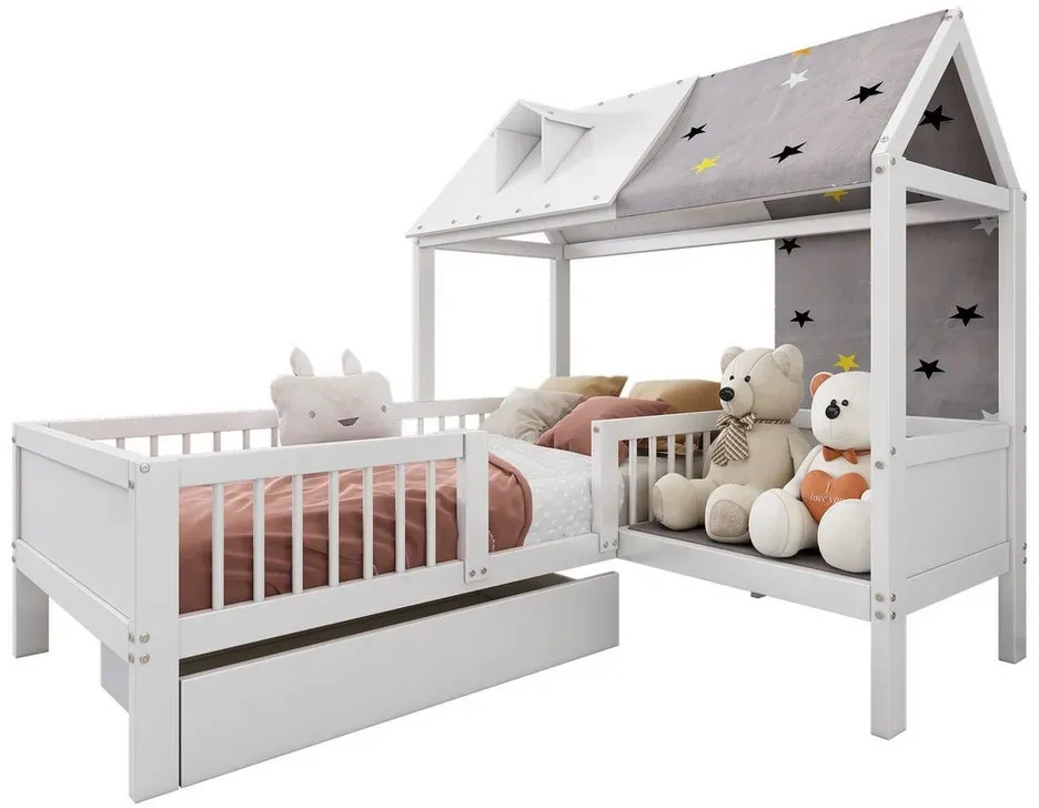 lieferbar-in 4-5 Werktagen bei dirFlieks Kinderbett, Massivholz Einzelbett Hausbett mit Zeltstoff und Schublade 90x200cm weiß