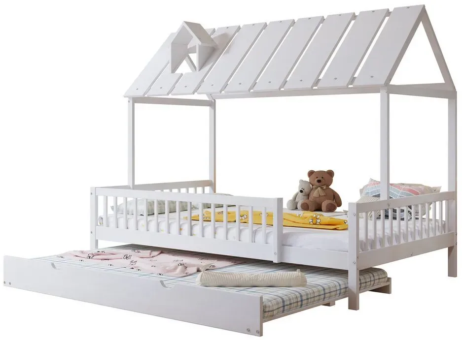 lieferbar-in 4-5 Werktagen bei dirFlieks Kinderbett, Hausbett 120x200cm mit Ausziehbett 120x190cm und Dach mit Kaminleiste weiß