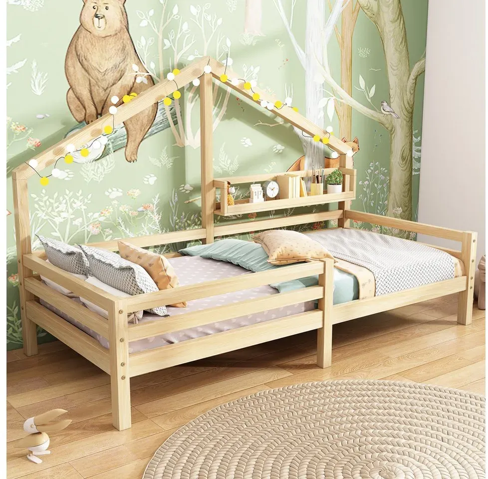 lieferbar-in 4-5 Werktagen bei dirFlieks Kinderbett, Massivholz Einzelbett Hausbett mit Ablageregal 90x200cm beige