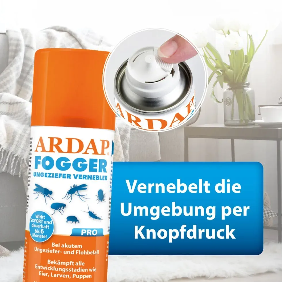 Zustand: Neu - 23,99 € / kg - Floh-, Läuse-, & Zeckensprays Floh-, Läuse- & Zeckensprays für Hunde - ARDAP Ardap Care GmbH - 077797 - EAN: 4019181777973 - Flohspray für Wohnung und Möbel: Wirkt schnell und effektiv Alternative zum ARDAP Fogger gegen Flöhe: Zur Abwehr von Flöhen Anti Flohspray: Für Haushalt, Tierhaltung, Gewerbe Mittel gegen Flöhe im Haus: Auch zur Abwehr von anderem Ungeziefer wie Ameisen, Fliegen, Spinnen, Silberfischchen und Milben. Deutsche Qualität: Das Mittel wurde von Schädlingsexperten entwickelt und wird in Deutschland mit geprüfter Wirksamkeit hergestellt. Repellierendes Biozidprodukt PT19: In Deutschland hergestelltes und registriertes Produkt unter BAuA Nr. N-113806: Biozidprodukte vorsichtig verwenden. Vor Gebrauch stets Etikett und Produktinformationen lesen - bei Amazon.de Dieser ARDAP Fogger ist ein Klassiker und bietet eine bewährte Lösung zur Flohbekämpfung in der Wohnung. ![]() ![]() ARDAP Fogger 200 ml