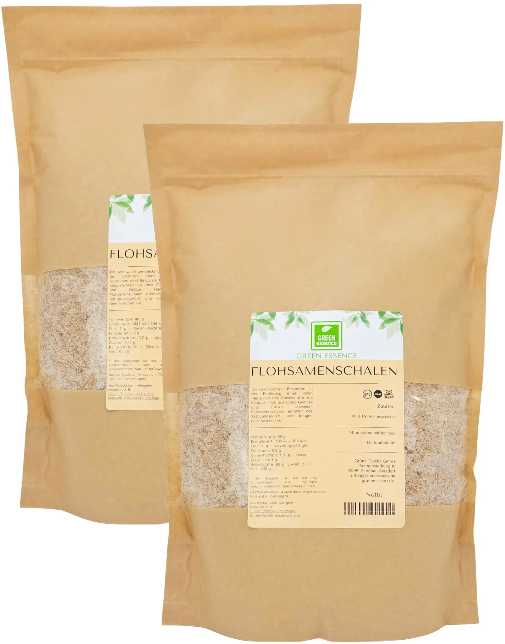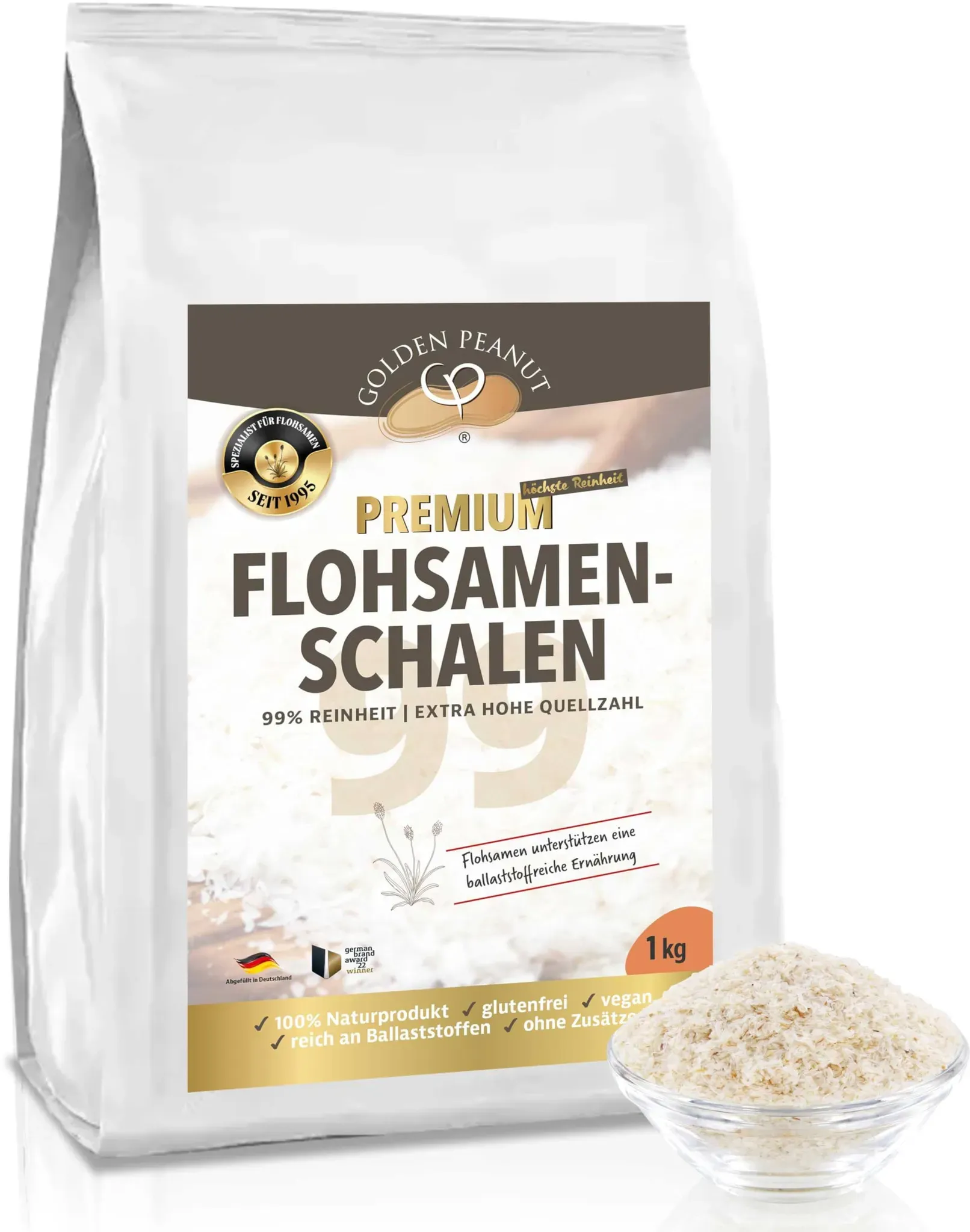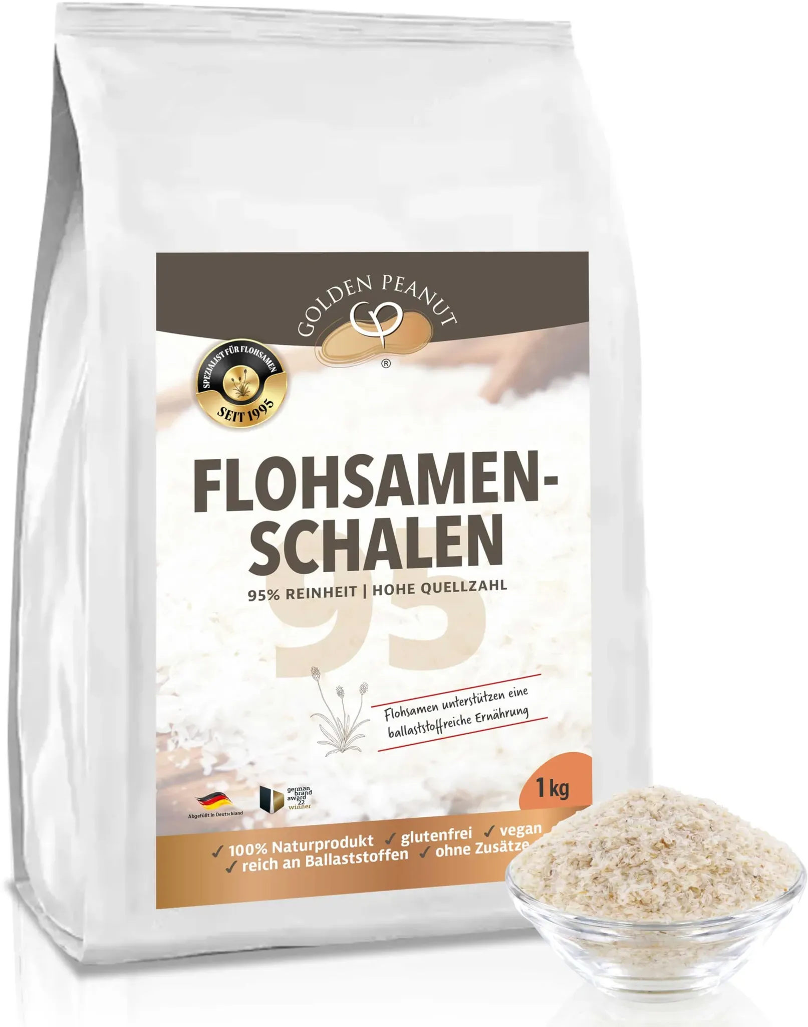 Verfügbarkeit: Auf Lager - Kategorie: Sonstige Grundnahrungsmittel - Green essence - GTIN:4255751101445 - Âï¸ÂWIE FUNKTIONIEREN DIE FLOHSAMENSCHALEN?? Flohsamenschalen Pulver sind eine ideale Quelle für natürliche Ballaststoffe (66 g/100 g). In Verbindung mit Wasser beginnt es zu quellen. Steigert das Sättigungsgefühl und verhindert unnötiges Naschen zwischen den Mahlzeiten. Die Schale bildet bei Kontakt mit Wasser ein geschmacksneutrales Gel, ähnlich wie Chiasamen oder Leinsamen. Âï¸ÂWIE MAN BALLASTSTOFFE IN FORM VON FLOHSAMENSCHALEN ZU SICH NIMMT? Die empfohlene Dosis beträgt etwa 7 Teelöffel pro Tag (aufgeteilt in 2-3 Portionen). Gießen Sie die Flüssigkeit über die Schalen (min. 200 ml) und trinken Sie es direkt. Es wird empfohlen, während der Einnahme von natürlichen Ballaststoffen etwa 2 l Wasser pro Tag zu trinken. Âï¸ÂZUTATEN: 100% Flohsamenschalen ÂPRAKTISCHE UND STABILE VERPACKUNG Alle pflanzlichen Rohstoffe, Cerealien, Mehle, Kräuter, Tees, Trockenfrüchte und Gemüse, die wir in unserem Naturkostladen anbieten, sind in hochwertigen Doypacks verpackt.  LESS WASTE: NUR Recycelte Füllstoffe | OHNE Luftpolsterfolie | Klebebänder aus Papier | NUR Pappkartons | Elektronische Quittungen | Von Hand verpackt. - 22,49 Euro bei Amazon Marketplace Health & Personal Care - gefunden von billiger.de GOLDEN PEANUT bietet hier Flohsamenschalen mit 99% Reinheit und höchster Quellzahl für 23.90 Euro, was auf eine hohe Qualität hindeutet. ![]() ![]() GOLDEN PEANUT Flohsamenschalen 1 kg, 99% Reinheit, Indien, Naturprodukt, höchste Quellzahl, ballaststoffreich, vegan