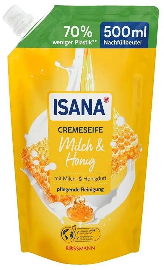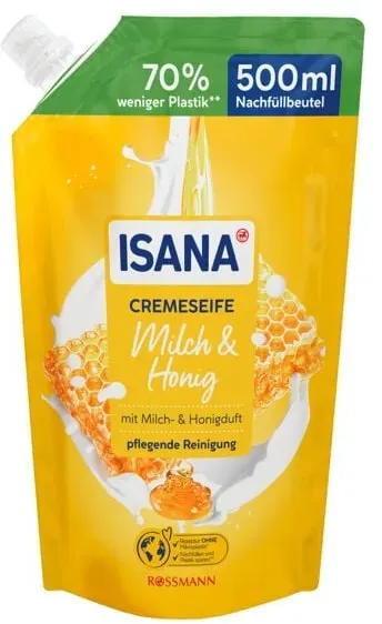 ISANA - EAN: 4068134111210 - Nachfüllpack Flüssigseife Milch & Honig 500 ml Cremeseife, Besonderheiten: Rezeptur ohne Mikroplastik, weniger Abfall dank Nachfüllbeutel, Verpackungsart: Nachfüllpack, Inhalt (Liter): 0.5 L, pH-hautneutral: Ja, Duftrichtung: Milch & Honig,... - bei otto-office.com - aus Yadore Produktdaten ![]() ![]() ISANA Nachfüllpack Flüssigseife Milch & Honig 500 ml Cremeseife gelb
