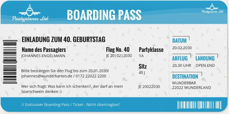 Kategorie: Grußkarten - wunderkarten - Einzigartige Einladungen zum Geburtstag in Blau mit eigenen Fotos und Texten ganz einfach selbst online gestalten. über 91.000 positive Bewertungen, gratis Musterkarten, kostenlose Hotline und schneller Versand! Ob unser schmales Ticket-Format, eine flache Karte, eine Klappkarte oder die Doppelklappkarte, bei uns finden Sie das passende Kartenformat. Veredeln Sie Ihre Einladungen zum Geburtstag mit Gold-, Silber, Ros - oder Perlmuttfolie. Unvergessliche und persönliche Karten: Ganz einfach gestalten mit eigenen Texten und Fotos. Gratis Hotline und Musterkarte mit schnellem Versand! Flache Karte, 16,6 cm x 11,8 cm, Blau - 2,20 Euro bei wunderkarten.de - gefunden von billiger.de Ein personalisierbares Flugticket mit Rubbelfläche, perfekt als kreative Geschenkverpackung für eine Reise. ![]() ![]() CraftWerk Flugticket mit Rubbelfläche - Personalisierbare Flugticket für Frauen, Freund oder Freundin - Boarding Pass als Geschenk Verpackung für Reise und Urlaub
