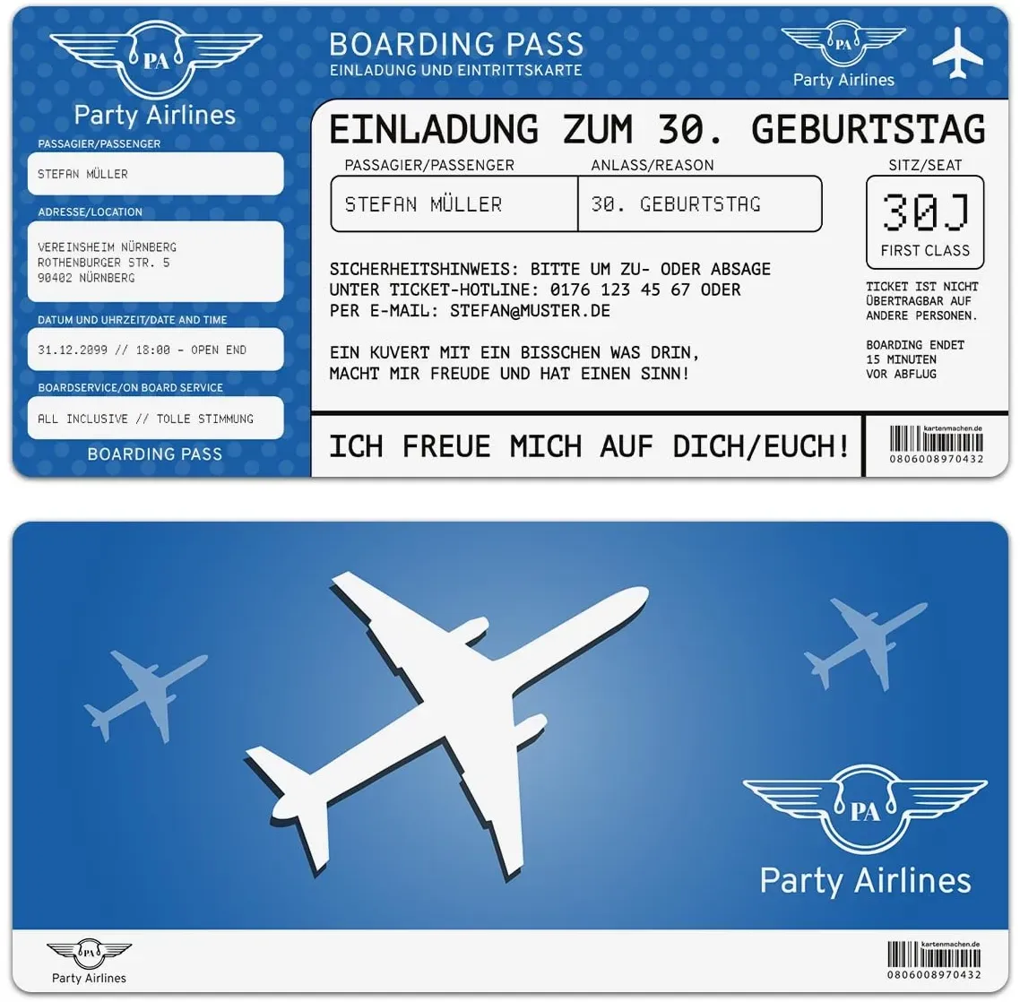 Verfügbarkeit: Auf Lager - Kategorie: Spardosen - del mà unique & personal - Das perfekte Geschenk - Kreatives Geldgeschenk für die nächste Reise, egal ob zum Geburtstag oder Weihnachten. Personalisiert - Wir personalisieren deine Tasse mit viel Liebe zum Detail. Das perfekte Geschenk für Familien - Egal ob als Geldgeschenk zum Geburtstag oder Weihnachten. Brillanter Druck - Kräftige, strahlende Farben und gestochen scharfer Druck Schneller & sicherer Versand - Wir verpacken deine Spardose so, dass es unbeschadet und ohne Kratzer in kurzer Zeit bei dir ankommt. Das DEL M Plus - Profitiere von unserem schnellen, lösungsorientierten & freundlichen Kundenservice. Deine Zufriedenheit steht bei uns an erster Stelle. - 14,90 Euro bei Amazon Marketplace Home - gefunden von billiger.de Personalisierte Einladungskarten zum Geburtstag im Flugticket-Design, ideal für eine thematische Party. ![]() ![]() Kartenmachen.de Personalisierte Einladungskarten zum Geburtstag (10-100 Stück) als Flugticket Party Ticket Karte Einladung Blau