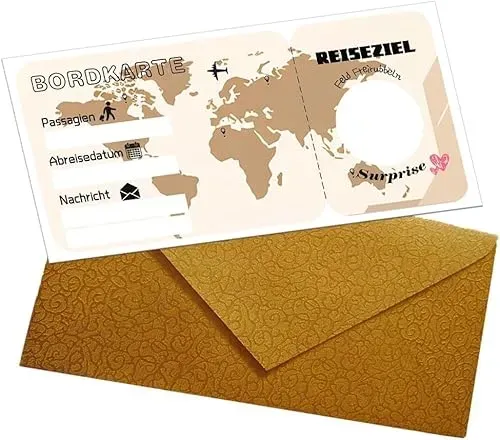 Zustand: Neu - Ankündigungskarten - Falkenhorn FALKENHORN - RG001 - EAN: 9506367146326 - 🌠Für Weltenbummler & Reisefans: Der originelle Reisegutschein im Boardingpass-Design eignet sich perfekt für Urlaube, Kurztrips, Wochenendtrips oder Erlebnisreisen. ðŸ–Šï¸ Personalisierbar & kreativ: Rückseite bietet Platz für Reisedetails wie Ziel, Flugnummer, Uhrzeit & persönliche Botschaft - mit Rubbelsticker für den Überraschungseffekt. 📦 Alles in einem Geschenkset: 1 Gutschein im DIN Lang Format, 1 elfenbeinfarbener Premium-Umschlag, 1 Rubbelfeld & 1 Cellophanhülle - alles in hochwertiger Ausführung. 🇩🇪 Handverpackt und Hergestellt in Deutschland: Gefertigt & konfektioniert von unserem Kleinunternehmen aus Troisdorf - jedes Set wird liebevoll von Hand zusammengestellt. 🧳 Besonders & hochwertig: Das Ticket sieht aus wie eine echte Bordkarte - ideal für Reisegutscheine, Fluggeschenke oder Abenteuer zu zweit. - Verkäufer: Falkenhorn im amazon.de Marketplace Eine stilvolle Reisegutschein Geschenkverpackung in Schwarz-Gold, die als Flugticket-Karte mit Rubbelaufkleber und Umschlag kommt. ![]() ![]() BETESSIN Reisegutschein Geschenk Verpackung Schwarz Gold - Flugticket Karte mit Rubbelaufkleber & Umschlag - Bordkarten zum Beschriften - Kreativ Reise Geschenk für überraschungsreise