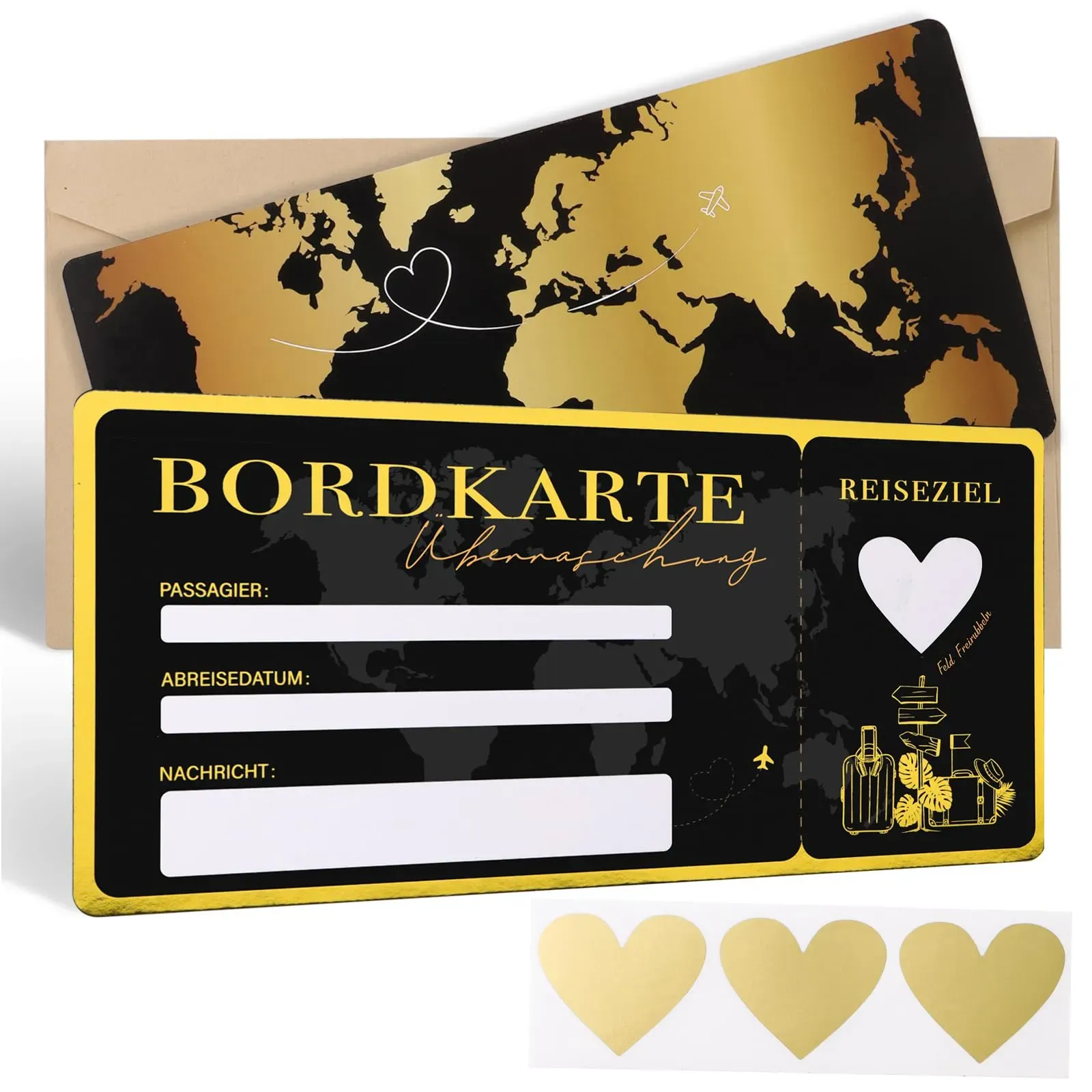 Kategorie: Bücher - BETESSIN - GTIN:6937010535861 - Kreatives Geschenkdesign im Flugticket-Look - Die Karte in Form einer eleganten Bordkarte ist perfekt, um eine Reise als überraschung zu verschenken stilvoll und einzigartig. Mit Rubbelherz für geheimen Reiseziel - Das integrierte Rubbel-Herz verbirgt den Zielort der Reise einfach freirubbeln und der überraschungseffekt ist rt! Komplettes Set mit Umschlägen & Stickern - Im Set enthalten sind 2 Reisegutscheinkarten, 2 Umschläge aus Kraftpapier und 3 goldene Rubbelsticker alles, was Sie brauchen, in einer Verpackung. Hochwertige Verarbeitung & edles Design - Die Karten bestehen aus stabilem 320g-Papier mit glänzender Goldprägung und doppelseitigem Druck ein echter Blickfang! Vielseitig einsetzbar - Ob für Geburtstag, Weihnachten, Hochzeit, Valentinstag oder einfach so dieses Set ist das perfekte Geschenk für Reiseliebhaber! - 4,99 Euro bei Amazon Marketplace Automotive - gefunden von billiger.de Ein in Deutschland hergestellter Reisegutschein im Boarding-Pass-Design mit Rubbelsticker, ideal für Urlaubsgeschenke. ![]() ![]() Falkenhorn - Reisegutschein Rubbelkarte Flugticket im Boarding-Pass-Design Zum Ausfüllen mit Rubbelsticker Geschenk für Urlaub, Erlebnisreise & Kurztrip inkl. Umschlag - Made in Germany