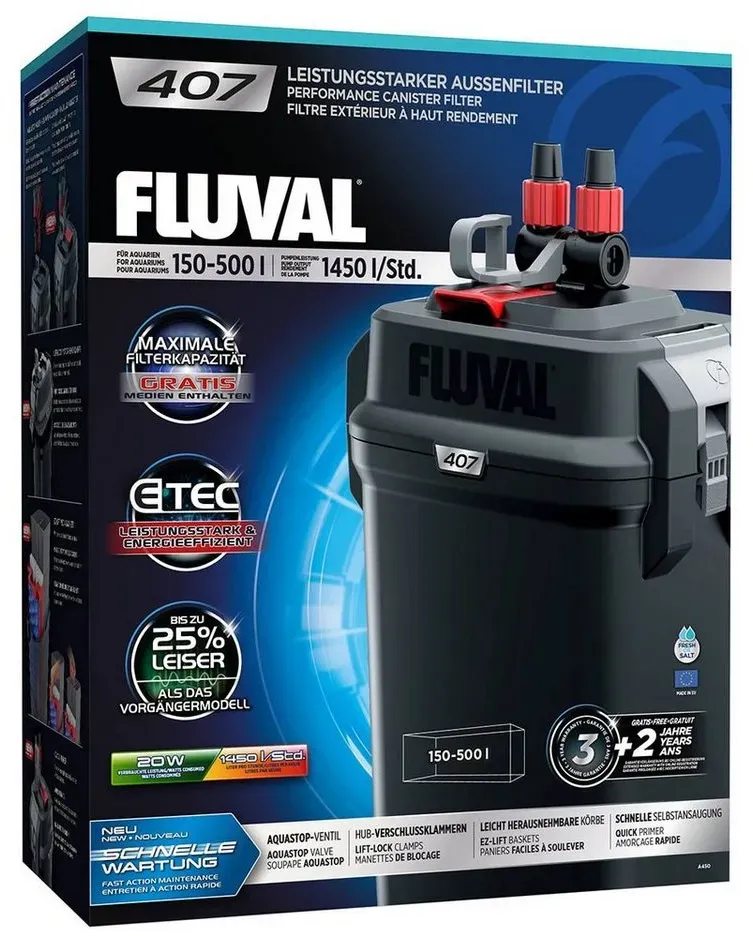 Zustand: Neu - Filter Aquarienfilter - Fluval Hagen Deutschland - A449 - EAN: 0015561104500 EAN: 0015561104494 - Pumpe ist bis zu 25 % leiser als das Vorgänger-Modell Größere Fußstabilisatoren dämpfen die Vibrationen des Filters SCHNELLE WARTUNG durch Optimierung SCHNELLE SELBSTANSAUGUNG - zur Auslösung muss weniger gepumpt werden in der Mitte kann der Hauptmedienstapel mit 1 Finger entfernt werden - bei Amazon.de Dieser Fluval 407 Außenfilter von Galaxus ist eine gute Option für größere Aquarien bis 500 Liter und bietet eine effiziente Filterung. ![]() Fluval 407 (500 l, Aussenfilter), Aquarium Filter