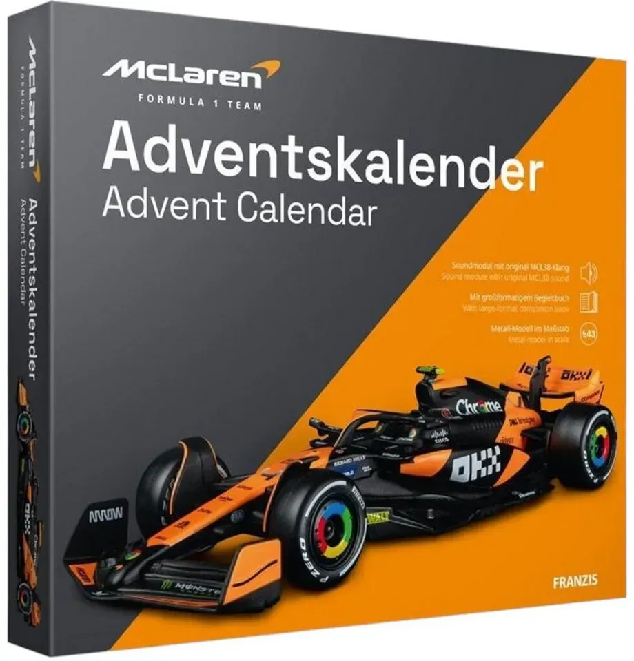Kategorie: Adventskalender - Franzis - GTIN:4019631673916 - Das Komplettpaket für alle Rennsport-Fans: In 24 Schritten zum McLaren Racing MCL38 Formel-1-Auto unterm Weihnachtsbaum, dem Maßstab entsprechend und inkl. Basis und Diorama ca. 20 x 15 x 10 cm groß Detailgetreues Fahrzeugmodell: mehrteiliger Bausatz mit Metallkarosserie zum Stecken und Schrauben, ganz ohne Kleben Liebevolle Details: 24 Wendeboxen aus umweltfreundlichem Karton ergeben auf der Vorder- und Rückseite jeweils ein großformatiges, attraktives Motiv und enthalten noch kleine überraschungen für den McLaren Racing-Fan Beeindruckende Effekte: In eine dynamische Steilkurve integriertes Soundmodul mit Original-Motorsound lässt das Modellfahrzeug auf Knopfdruck lebendig werden. Exklusives Zubehör: Wertiges, großformatiges Begleitbuch, verfasst in Zusammenarbeit mit Mc Laren Racing. inkl. der Geschichte aller McLaren Formel-1-Fahrzeuge bis heute - 75,00 Euro bei Amazon Marketplace Automotive - gefunden von billiger.de ![]() ![]() FRANZIS 67391 - McLaren Racing Adventskalender 2025 - Modellbausatz im Maßstab 1:43, inkl. Soundmodul und 52-seitigem Begleitbuch