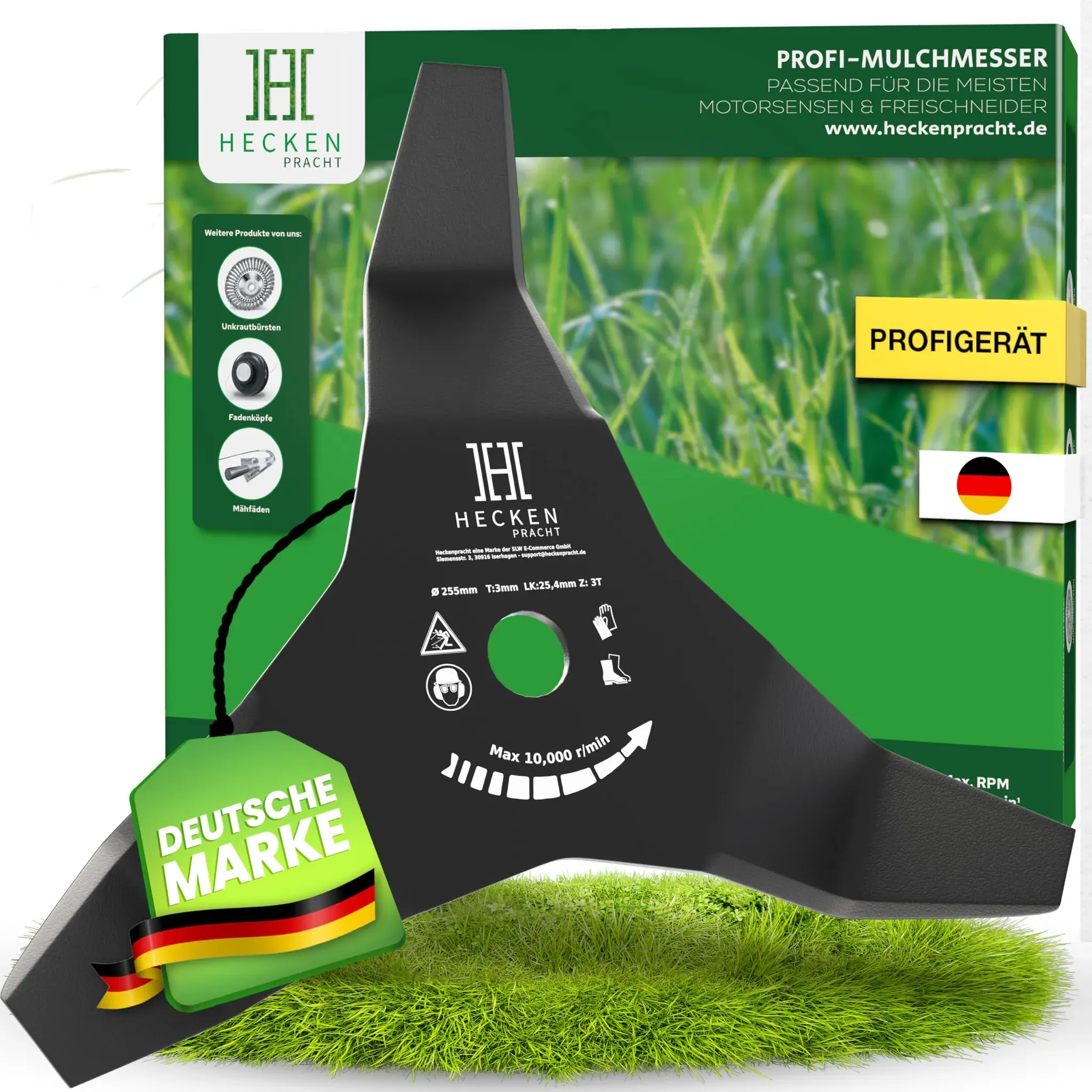 Zustand: Neu - Rasentrimmermesser - Heckenpracht - - EAN: 4262361210160 - œ MÜHELOS DURCH HOHES GRAS - Unser Freischneider-Messer schneidet kraftvoll durch hohes Gras, Gestrüpp und dichte Vegetation - perfekt für großflächige Grundstücke und hartnäckiges Wildkraut. œ EXTREM LANGLEBIG - Gehärteter Stahl mit einer Härte von 42-48 HRC & präziser 3-Zahn-Klinge †’ hält auch bei täglicher Belastung besonders lange und ist extrem verschleißfest - ideal für Profis mit höchsten Ansprüchen. œ UNIVERSELL KOMPATIBEL - Dank der universellen Aufnahme ist unser Trimmer-Messer passend für fast alle gängigen Freischneider (25,4 mm Bohrung) - ideal für nahezu alle Marken und Modelle. œ SCHARF & EFFIZIENT - Die optimierte Klinge unseres Dickichtmessers zerkleinert Gras und Gestrüpp mühelos und sorgt für einen sauberen Mulcheffekt †’ für maximale Flächenleistung in kürzerer Zeit. œ EINFACH ZU MONTIEREN - In wenigen Minuten einsatzbereit - kein Werkzeugwechsel, keine Frustration. Mit dem Freischneider-Aufsatz kannst du sofort loslegen und effizient schneiden. - Verkäufer: SLW E-Commerce GmbH im amazon.de Marketplace Das Heckenpracht Mulchmesser ist ein robustes 3-Zahn Häckselmesser, ideal für präzise Flächenpflege und hohes Gras. ![]() ![]() Heckenpracht Mulchmesser Freischneider | 3,0 x 300mm | Extrem robustes 3-Zahn Häckselmesser für Motorsense & Trimmer Mühelos hohes Gras schneiden Profi Dickichtmesser für präzise Flächenpflege