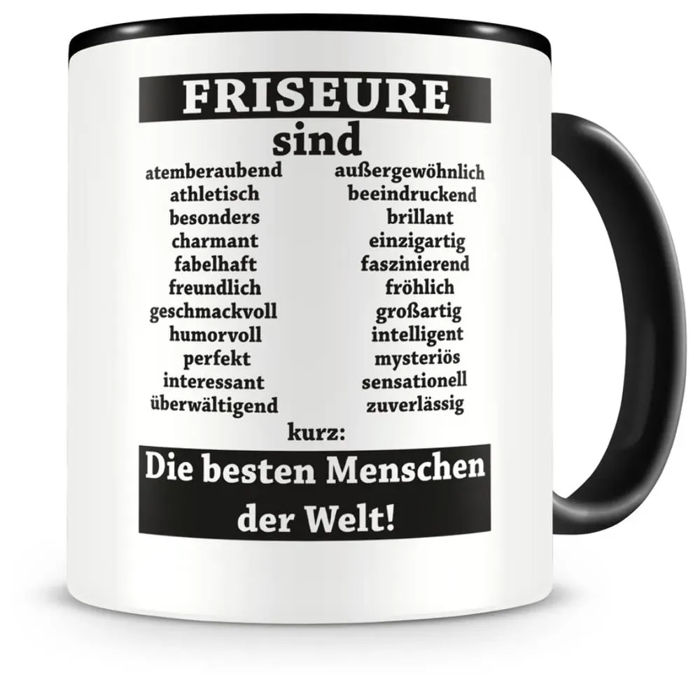 Kategorie: Tassen & Becher - Samunshi - Tasse Friseure sind... 300ml schwarz/schwarz Keramiktasse für Kaffee oder Tee Bedruckte Tasse als Geschenkidee Modellnummer: 01V003807 Bedruckung im Sublimationsdruck erfolgt in Deutschland - 14,95 Euro bei Amazon Marketplace Kitchen - gefunden von billiger.de Das Bildwörterbuch von Britta Kleemiß ist eine praktische Hilfe für Friseure, um Fachbegriffe in verschiedenen Sprachen zu lernen. ![]() MEDIMOPS Britta Kleemiß - Bildwörterbuch Friseure: Fachbegriffe Deutsch - Englisch - Muttersprache