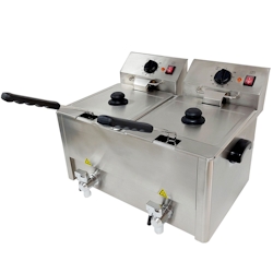 Fritteuse Haushaltsgeräte Haushaltskleingeräte Fritteusen Elektrische Fritteuse - EAN:4260223025440 - Elektro-Fritteuse - 2 x 8 Liter - EGO Thermostat von Royal Catering œ Modell: RCEF 08D-EGO œ Artikel: 10010151 ¬‡ï¸ Hauptmerkmale hohe Kapazität für große Mengen Frittiergut - 2 x 8 l Kapazität / 2 x 4 l Öl-Kapazität hochwertige E.G.O. Thermostate - präzise Einstellungen von 50 bis 190 °C herausnehmbare Ölbecken und Heizelemente erleichtern die Reinigung pflegeleicht und langlebig - hochwertiger Edelstahl zwei robuste Frittierkörbe - flexible Gerichtezubereitung ¬‡ï¸ Technische details Timer Nein Bedienungsanleitung Ja Ablasshahn Nein Mit Schrank Nein Füllmenge max. 8 l Thermoschutz Ja Gesamtkapazität 16 l Material Edelstahl Farbe Silbern Leistung [W] 2 x 2500 Frittierkorb [mm] 210 x 145 x 120 Spannung [V] 230 Leistung max. [W] 5000 Maße Behälter [cm] 27 x 19 x 17 ¬‡ï¸ Produktbeschreibung Royal Catering bietet die perfekte Fritteuse für genussvolle und komfortable Speisenzubereitung. Sie lieben Ihre Pommes Frites frisch frittiert und goldgelb glänzend? Dann ist die Doppel - gefunden von Kelkoo Diese professionelle elektrische Doppel-Fritteuse ist ideal für den Gastronomiebereich oder sehr große Haushalte. ![]() Elektrische Profi-Fritteuse Febal F-88 mit 2 Behältern mit einem Fassungsvermögen von je 8 Litern.