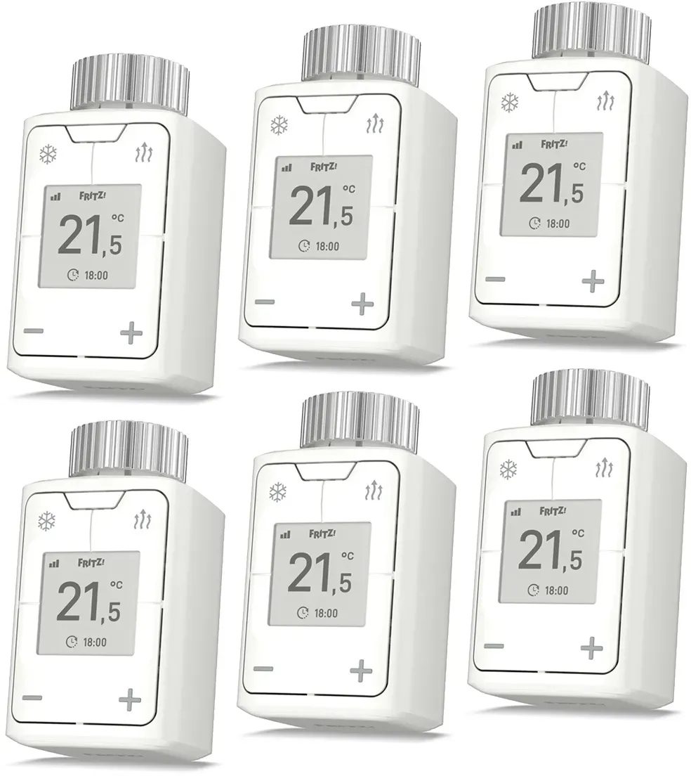 ? Was ist das FRITZ!DECT 302 6er-Set?Das Set besteht aus sechs intelligenten Heizkörperthermostaten, die sich per DECT-Funk mit Ihrer FRITZ!Box verbinden. Sie können Ihre Heizung damit automatisch steuern, Energie sparen und das Raumklima komfortabel regeln.