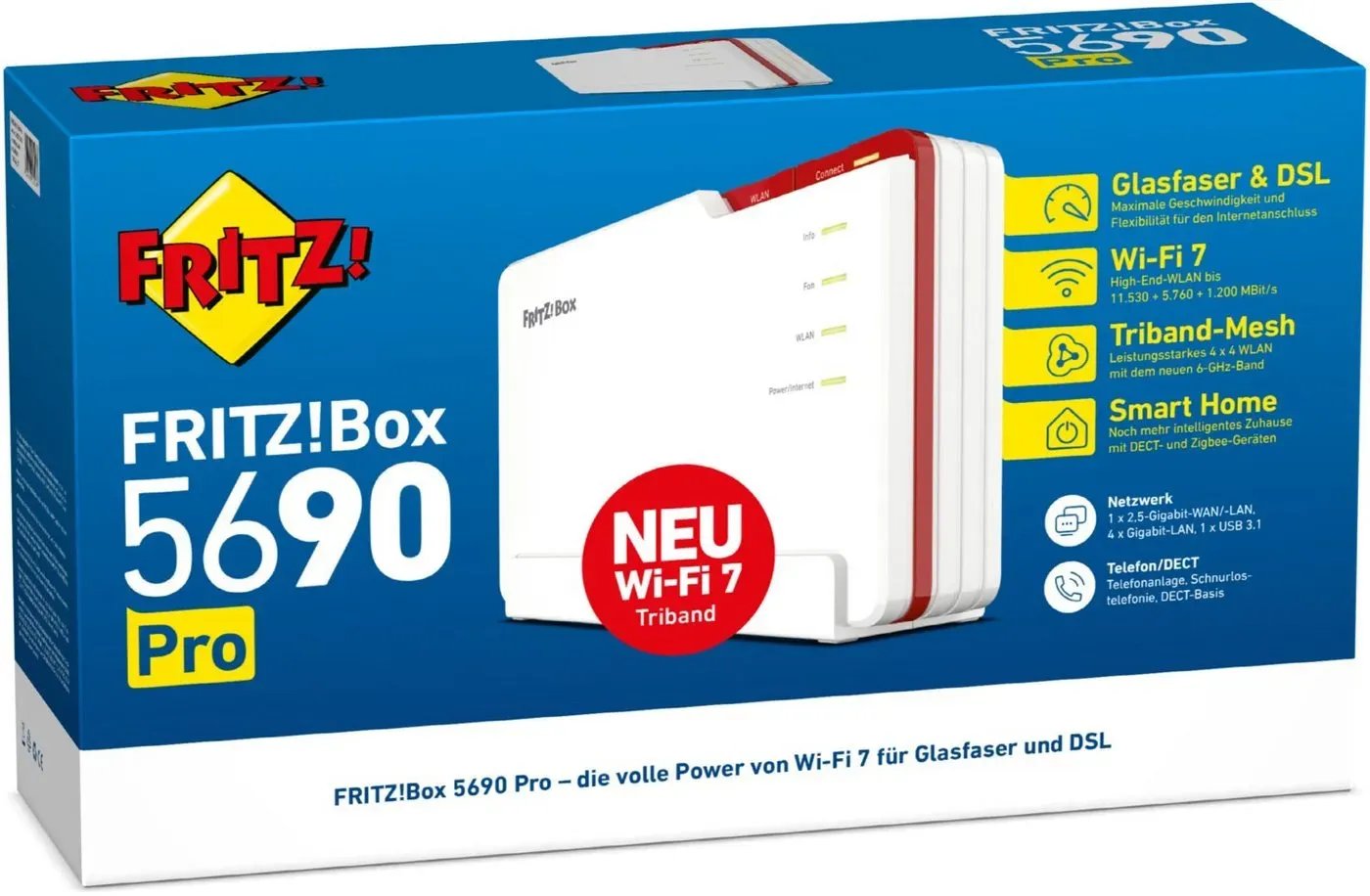 Kategorie: Router - AVM - GTIN:4023125030437 - FRITZ!Box 5690 Pro im überblick Leistungsstarker Glasfaser- und DSL-Router mit Wi-Fi 7 Unterstützt Glasfaserstandards GPON bis 2.5 GBit/s sowie AON bis 1 GBit/s Unterstützt DSL inklusive Supervectoring 35b bis 300 MBit/s Anschluss an Glasfaser-Modem (ONT) Optimal für Videostreaming und IPTV Smart-Home-Funktionen für Strom, Wärme, Licht und mehr (Zigbee/DECT ULE) Integriert LED-Lampen und andere Geräte über Zigbee FRITZ!App Smart Home für die komfortable Bedienung Ihres FRITZ! Smart Home Telefonanlage für IP-basierte Anschlüsse Integrierte DECT-Basis für bis zu 6 Schnurlostelefone Anschluss für ein analoges Telefon, Fax oder Anrufbeantworter 5 integrierte Anrufbeantworter inkl. Voice-to-Mail Telefonbuchkontakte lokal oder online verwalten (Google, Apple und Telekom) Die Premium-FRITZ!Box für Glasfaser und DSL mit Wi-Fi 7 und Zigbee Die FRITZ!Box 5690 Pro setzt neue Maßstäbe. Das Premium-Modell bietet die Möglichkeit direkt mit dem Glasfaseranschluss (GPON und AON) verbunden zu werden und unterstützt auch DSL-Anschlüsse. Mit Wi-Fi 7 einschließlich des neuen 6 GHz-Bands überzeugt sie durch verbesserte Latenz, Geschwindigkeit und Durchsatz und bietet damit Höchstleistungen im Heimnetz. Die Integration des Zigbee-Funkstandards ermöglicht die Nutzung vieler smarter Anwendungen im Bereich Energieeffizienz, Heizen und Licht. Gigabit-LAN-Anschlüsse, 2.5G LAN Port, komfortable Telefonie, VPN, WLAN-Gastzugang, Firewall und USB 3.1 für ... Der Media Markt Online Shop bietet die FRITZ!Box 5690 Pro ebenfalls für 299 Euro an, was ein sehr attraktiver Preis für dieses Modell ist. ![]() ![]() AVM FRITZ!Box 5690 Pro, (Wi-Fi 7) WLAN Mesh Glasfaser Router 18,49 Gbit/s