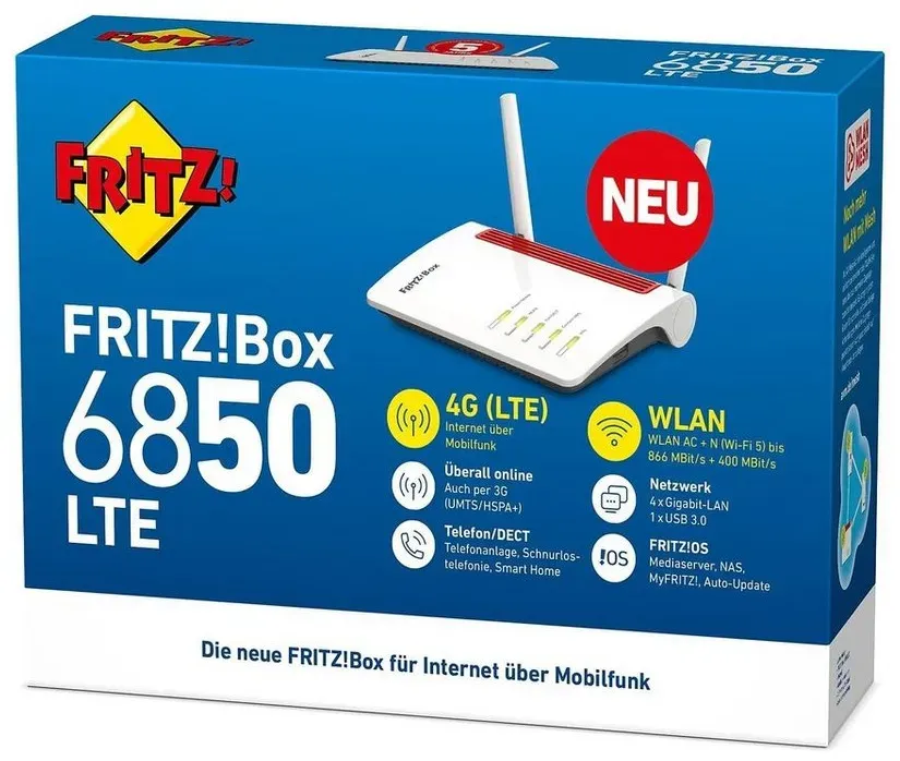 AVM - EAN: 4023125029257 - AVM FRITZ!Box 6850 LTE WLAN Router | 4G LTE Modem | Dualband AC+N | Mesh | 4x Gigabit LAN | DECT | USB 3.0 | SIM-Slot - bei smartgoods.de - aus Yadore Produktdaten Ein attraktives Angebot von OTTO für die FRITZ!Box 6850 LTE in Rot. ![]() ![]() AVM FRITZ!Box 6850 LTE WLAN-Router, Internet über LTE-Mobilfunk rot