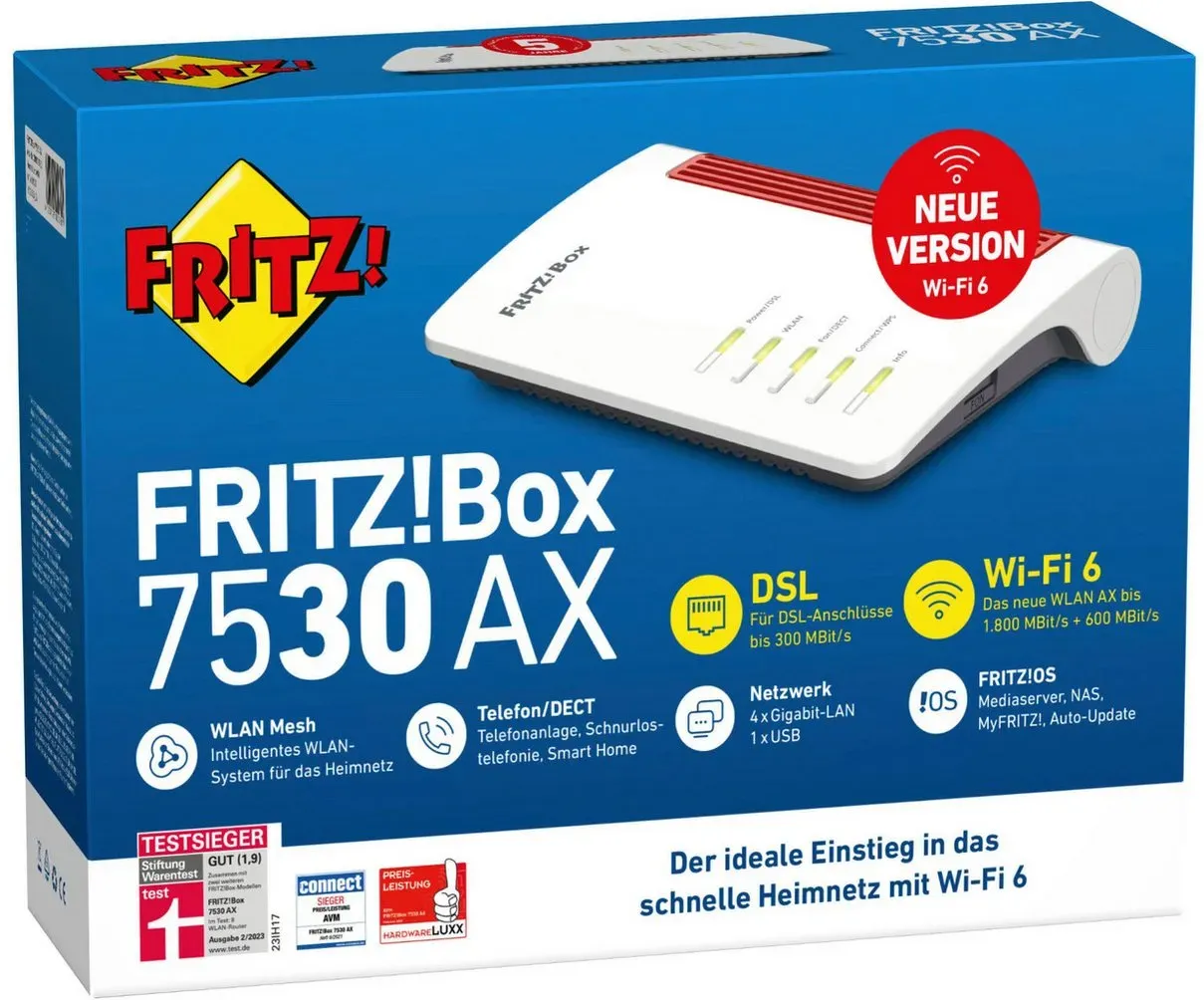 Zusammenfassung für Ihre Kaufentscheidung: | Kriterium | Details | |-------------------------|-------------------------------------------------------------------------------------------| | WLAN-Standard | Wi-Fi 6 (802.11ax), Dual-Band (2,4 & 5 GHz), bis 2400 MBit/s brutto | | DSL-Modem | VDSL2 Supervectoring 35b bis 300 MBit/s | | LAN-Ports | 4 x Gigabit Ethernet | | Telefonie | DECT-Basis, VoIP, Fax, Anrufbeantworter | | Sicherheit | WPA3, Firewall, VPN (WireGuard, IPSec), Kindersicherung | | Besonderheiten | Mesh-fähig, USB 3.0 Anschluss, einfache Einrichtung | | Preisbereich | Ca. 130-175 Euro, gelegentlich günstiger bei Aktionen | | Geeignet für | DSL-Anschlüsse bis 300 MBit/s, Wohnungen bis ca. 100 m², Nutzer mit Telefoniebedarf | Wenn Sie eine zuverlässige, gut ausgestattete FRITZ!Box mit aktuellem WLAN-Standard und Telefoniefunktionen für DSL suchen, ist die FRITZ!Box 7530 AX eine sehr gute Wahl im mittleren Preissegment. Für die Suche und Preisvergleich können Sie die FRITZ!Box 7530 AX direkt im Meta-Preisvergleich nutzen. Jetzt live Suche nach fritz box 7530 ax starten! Empfohlene Fritz box 7530 ax Angebote*Durch Käufe über Links zu Händlern kann diese Website eine Provision erhalten, u.a. durch das eBay Partner Network und das AmazonPartnerNetHier ist eine Auswahl von 15 repräsentativen und empfehlenswerten Fritz!Box 7530 AX Angeboten, die verschiedene Preisbereiche und Arten abdecken: Dieses Angebot ist mit 156.18 Euro das günstigste für eine neue Fritz!Box 7530 AX von Voelkner.de. ![]() ![]() Decoralin Wandhalterung kompatibel mit Fritz!Box 7530, 7530 AX, 7510, 5530, 4050, 6850 LTE/5G €“ Routerhalterung zur Wandmontage €“ Grau