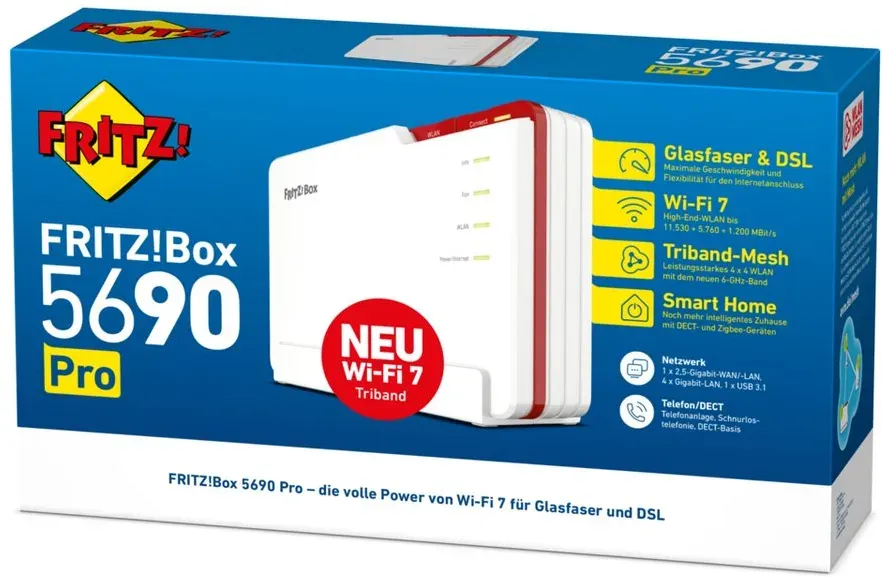 FRITZ! - EAN: 4023125030437 - Maximale Geschwindigkeit mit Wi-Fi 7 auch im aktuellen 6-GHz-Band für den Glasfaser- oder DSL-Anschluss. Zigbee und DECT für das FRITZ! Smart Home. Bequeme Telefonie, intelligente Sicherheitsfunktionen für sorgenfreies Surfen und Streaming. Kurzum: Die FRITZ!Box 5690 Pro ist der Profi für das digitale Zuhause. - bei galaxus.de - aus Yadore Produktdaten Dieses Angebot hebt sich durch die explizite Erwähnung von Wi-Fi 7 und Smart Home Funktionen hervor, was es zu einer zukunftssicheren Wahl macht. ![]() kaufland.d e FRITZ!Box 5690 Pro Wifi 7-Router Gigabit Ethernet Tri-Band (2,4 GHz / 5 GHz / 6 GHz) für Glasfaser & DSL-Anschlüsse, WLAN Mesh, DECT-Basis