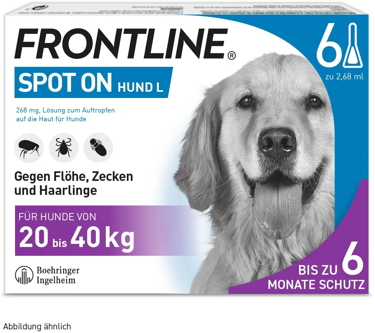 Kategorie: Tiergesundheit - Boehringer Ingelheim - GTIN:3661103009832 - WIRKT SCHüTZEND: Flöhe werden innerhalb von max. 24 Stunden & Zecken innerhalb von max. 48 Stunden abgetötet WIRKT ZUVERLäSSIG: Die Wirkung tritt ein, sobald der Parasit die Haut berührt somit muss es nicht erst zum Stich kommen WIRKT VERTRäGLICH: Der Wirkstoff wird nur äußerlich auf der Haut & in den Talgdrüsen des Tieres gespeichert BEWäHRT: FRONTLINE SPOT ON basiert auf Wissenschaft & jahrelanger Forschung Von Apothekern & Tierärzten empfohlen - PZN: 02246389 - 37,81 Euro bei Amazon Marketplace Lawn & Garden - gefunden von billiger.de Ein attraktives Angebot für große Hunde (20-40 kg) mit 6 Pipetten, ideal für eine langfristige Zecken- und Flohprophylaxe. ![]() ![]() Merial FRONTLINE Spot ON Hund L gegen Zecken, Flöhe & Haarlinge (große Hunde 20 bis 40 kg) - 6X Pipetten für bis zu 6 Monate Schutz - wasserfest