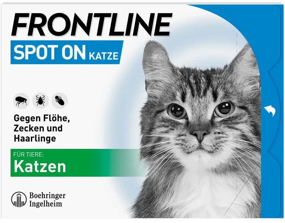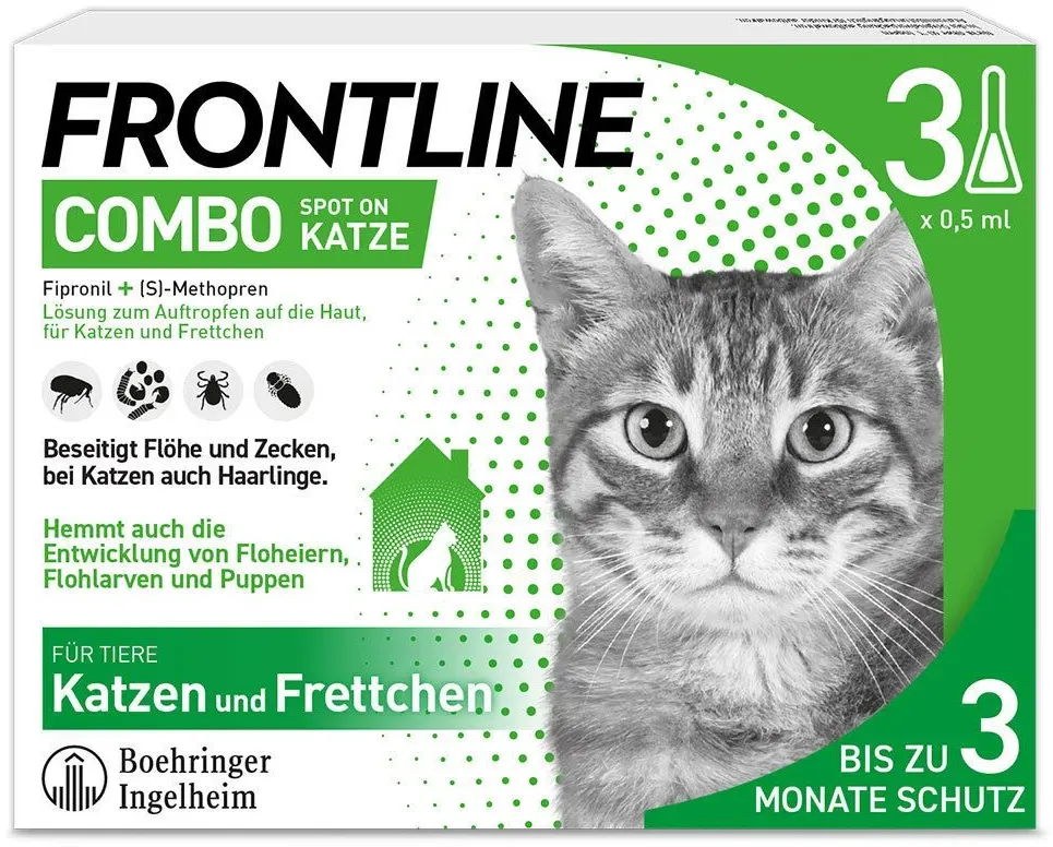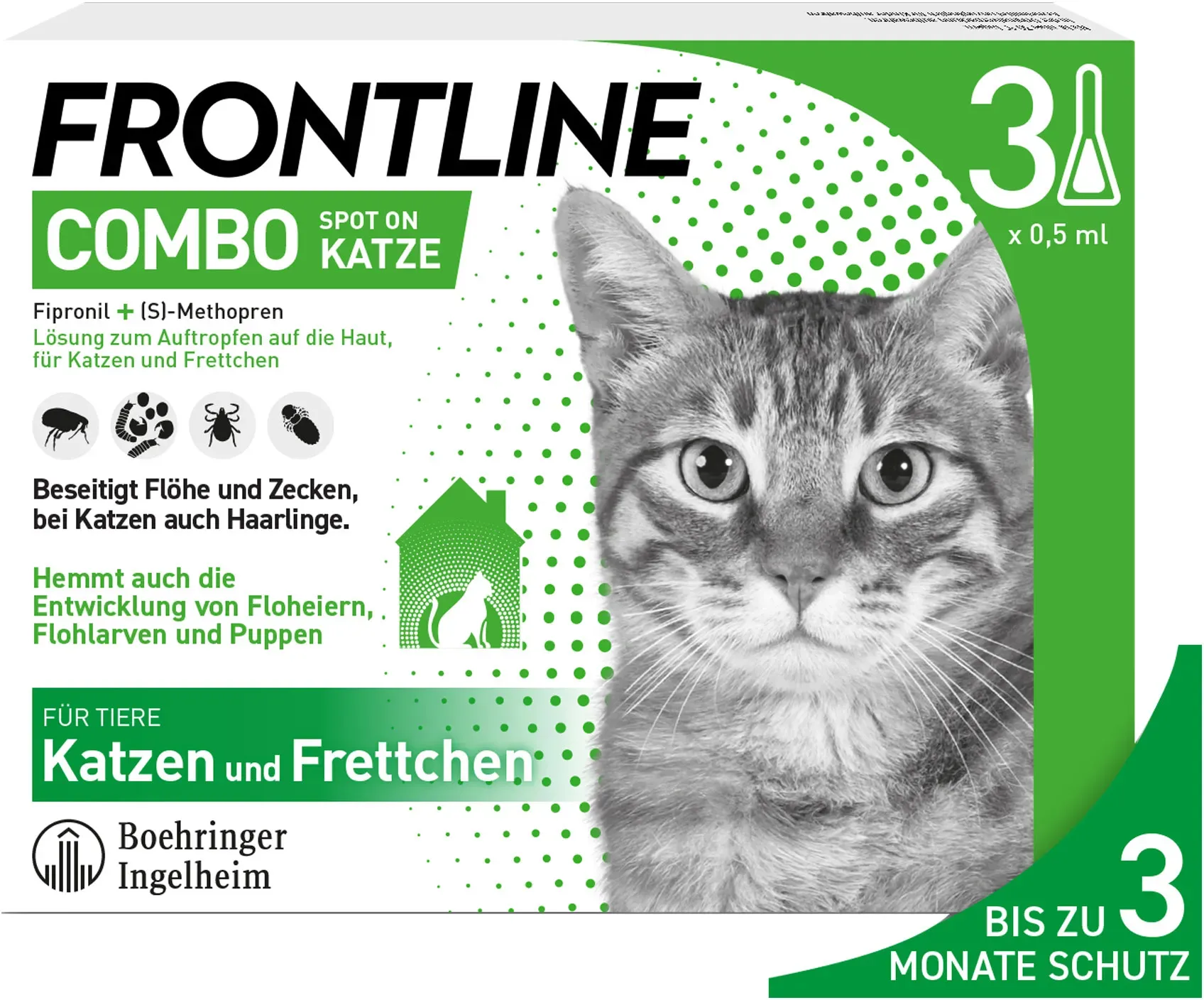 6,27 /Stück - Kategorie: Tiergesundheit - Boehringer Ingelheim - GTIN:4064951001307 - PZN:17885020 - FRONTLINE Combo Spot on Katze Lsg.z.Auft.a.Haut 3 St - 18,80 Euro bei Preisapo - gefunden von billiger.de Dieses Angebot ist eine preiswerte Option für 3 Pipetten des klassischen Frontline Spot on. ![]() ![]() FRONTLINE Spot ON Katze gegen Zecken, Flöhe & Haarlinge (für Jede Größe & Gewicht) - 3X Pipetten für bis zu 3 Monate Schutz - wasserfest