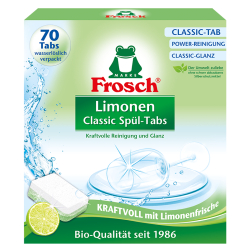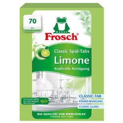 14 Händlerangebote bei billiger.de - Kategorie: Reinigungsmittel - Frosch - kraftvolle Reinigung & Glanz löst angetrocknete Speisereste und hartnäckige Teeflecken mit natürlichem Soda wirkt Glastrübungen entgegen und erhält den Glanz Umweltkarton aus 95% Altpapier 70 Tabs mit wasserlöslicher Folie - GTIN:4001499958694 ![]() ![]() Erdal-Rex GmbH Frosch Classic Spülmaschinentabs Limone, geruchsneutralisierend, Kraftvolle Geschirrspültabs mit angenehmem Geruch nach Limone, 1 Packung = 70 Tabs 116335
