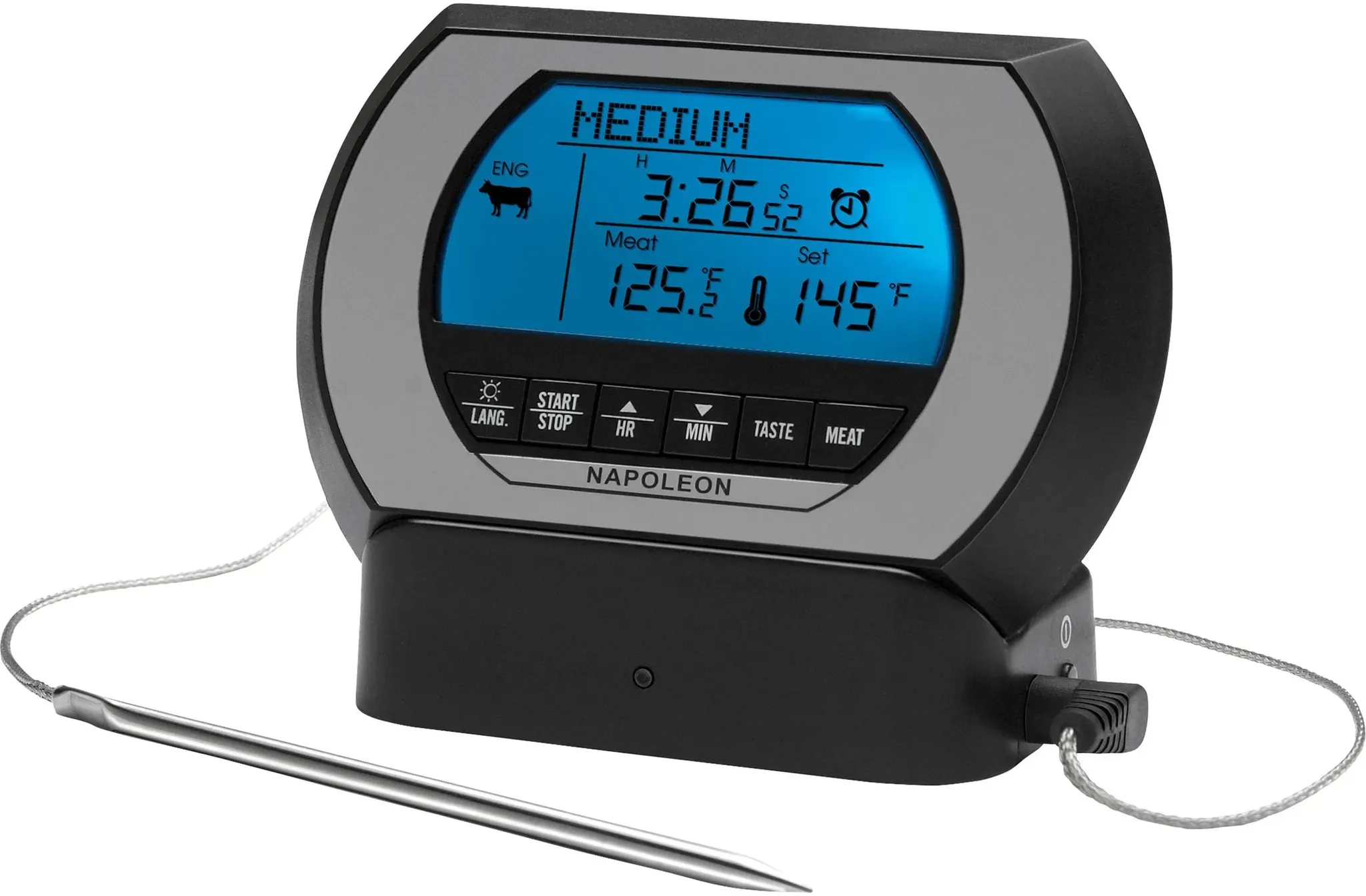Maverick - EAN: 0011502111408 - Das Extended Range BBQ & Meat Funkthermometer XR-40 ist mit der innovativen INSTA-SYNC -Technologie ausgestattet. Dadurch wird die Reichweite (bis zu 160 Meter) erweitert, die Verbindung ist schneller und Interferenzen während der Verbindung werden reduziert. So braucht man sich nie wieder Sorgen, ob das Fleisch bei der richtigen Temperatur gart. Dazu verfügt es über ein deutlich lesbares Display zu allen Tageszeiten (Orange reverse). Mit den zwei Sonden können entweder die Temperatur im Garraum und die Kerntemperatur des Grillgutes, zwei verschiedene Kerntemperaturen oder zwei Garraumtemperaturen überwacht werden. Die Bedienung ist einfach und das XR-40 ist mit 15 voreingestellten Temperaturen für verschiedene Fleischsorten. Für weiteren Komfort sorgt der Signalton beim Erreichen der eingestellten Temperatur und wenn die Verbindung länger als eine Minute unterbrochen ist. Die Temperatur kann wahlweise in Celsius oder Fahrenheit angezeigt werden. - bei alternate.de - aus Yadore Produktdaten Ein hochwertiges Napoleon Grillthermometer, das für seine Zuverlässigkeit und Präzision bekannt ist. ![]() ![]() Napoleon, Grillthermometer, Funkthermometer