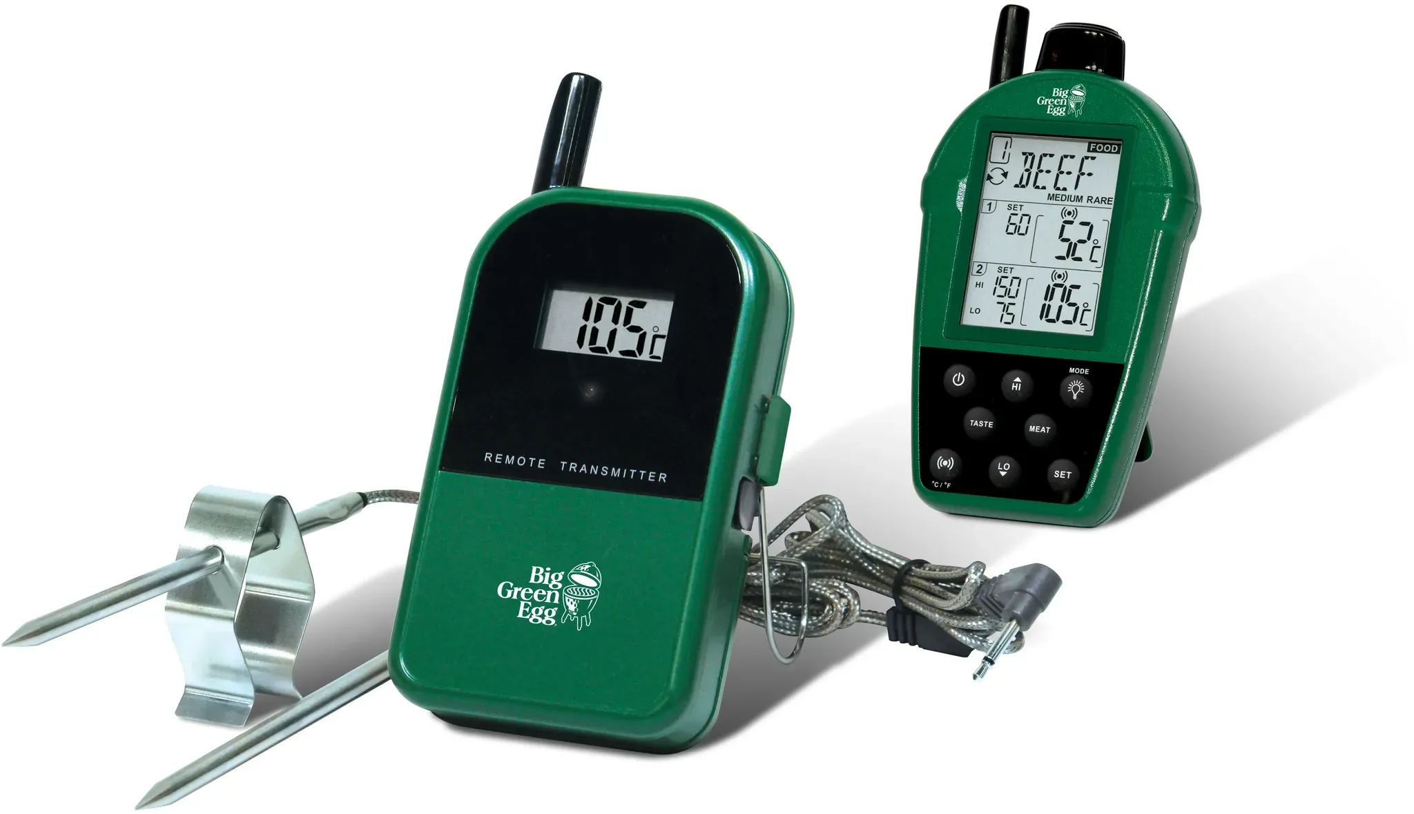 Kategorie: Grillzubehör - Napoleon - GTIN:0629162700063 - Sie wollen nicht die ganze Zeit vor dem Grill stehen bleiben und die Temperaturen von Grill und Fleisch überwachen, sondern lieber bei Ihren Freunden sitzen? Dann machen Sie es sich doch mit dem digitalen Funkthermometer von Napoleon ganz einfach. Das Funkthermometer überträgt die exakte Temperatur über eine Reichweite von bis zu ca. 60 Metern auf das praktische Display, auf dem Sie alle wichtigen Daten ganz bequem ablesen können. Stecken Sie den Edelstahl-Fühler des Napoleon Grillthermometers in den Braten, das Grillhähnchen oder anderes Grillgut, schliessen Sie den Fühler an der Station an und schon kann es losgehen. Die Station stellen Sie einfach auf die Seitenablage des Grills und für das tragbare Display nehmen Sie es einfach mit. Mit der Halterung können Sie das Thermometer an Ihrem Gürtel befestigen oder es mit Hilfe eines klappbaren Bügels hinstellen, wo Sie sich gerade aufhalten. Mit zwei kleinen Magneten auf der Rückseite kann das Grillthermometer auch an magnetische Oberflächen geheftet werden. Natürlich können Sie es auch einfach auf der Station stehen lassen, während Sie sich um Beilagen oder ähnliches kümmern. Das Thermometer hat vier Anzeigesprachen (Deutsch, Englisch, Französisch und Spanisch), die einfach genau wie die verschiedenen Funktionen einstellbar sind. Für die Einstellungen liegt ein detailliertes Handbuch in der Verpackung. Betrieben wird das Funkthermometer sowie die Station mit jeweils ... Dieses Big Green Egg Funk Thermometer mit zwei Fühlern ist eine ausgezeichnete Wahl für anspruchsvolle Grillmeister, die mehrere Temperaturen gleichzeitig überwachen möchten. ![]() ![]() Big Green Egg Funk Thermometer mit zwei Fühlern