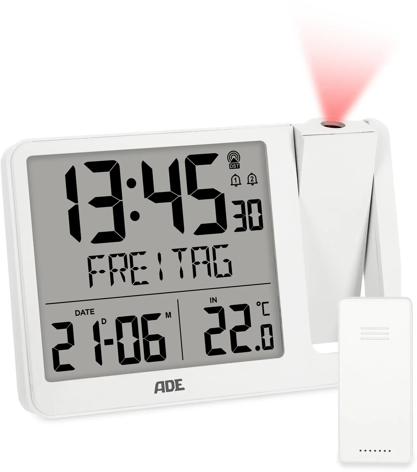 Kategorie: Wecker - Soundmaster - GTIN:4005425003212 - PLL- UKW/MW Radio mit Festsendespeicher Vollautomatische Zeit- und Datumseinstellung durch DCF-77 Funksignal 1,8' Jumbo LCD-Anzeige Dualalarm mit Wochenendfunktion und Snooze Wecken mit Radio oder Signalton Mit Helligkeitsdimmer (High/Low/Auto-Off) Auto-off = nach 10 Sekunden Inaktivität schaltet sich das Display aus durch Aktivierung des Sensors wird das Display wieder eingeschaltet Infrarotsensor für Radiofrequenz- und Einschlaf- und Schlummerfunktion Zeitprojektion an Wand oder Decke Projektionsanzeige zuschaltbar & 180 drehbar - 39,90 Euro bei Amazon Marketplace CE - gefunden von billiger.de Dieser ADE Funkwecker bietet eine Projektion, zwei Weckzeiten, Temperaturanzeige und einen Außensensor für umfassende Informationen. ![]() ![]() ADE Digitaler Funkwecker mit Projektion und Außensensor | Projektionswecker mit 2 Weckzeiten| Uhr mit Temperaturanzeige, Datum und Wochentag | inkl. Netzkabel | weiß