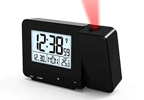 Kategorie: Wecker - Miraval - GTIN:4005197623083 - Dieser Funk-Projektionswecker von Miraval Germany ist ein echter Alleskönner. Die Uhrzeit wird dank eines verbauten DCF Funk-Empfängers in wenigen Minuten automatisch eingestellt. Sie müssen nie wieder zwischen Sommer- & Winterzeit manuell die Uhr umstellen. Ebenfalls zeigt der Wecker das aktuelle Datum sowie die Kalenderwoche an. Auch die aktuelle Raumtemperatur wird dank eines Sensors ermittelt und angezeigt. Touch Funktion: Der Snooze sowie Auslöser der Projektion wird per Touch Steuerung auf dem Gerät ausgelöst. Sie müssen den Wecker nur auf der Oberseite antippen und das Gerät projiziert die aktuelle Uhrzeit auf die von Ihnen ausgewählte Fläche. Dank des um 90 schwenkbaren Projektions-Elements können Sie selbst entscheiden auf welcher Fläche die Uhrzeit angezeigt werden soll. Auch die Größe der Projektion können Sie dank einer Fokuseinstellung selbst wählen. Der Wecker kann wahlweise mit 3x AAA Batterien (nicht im Lieferumfang enthalten) oder per mitgelieferten Netzteil betrieben werden. Es lassen sich zwei verschiedene Weckzeiten einstellen, welche jede für sich ein- & ausgeschaltet werden kann. Ladefunktion: An der Seite des Weckers ist ein USB-Stecker verbaut, mit diesem können Sie ihr Smartphone oder andere Geräte bequem laden. Durch seine digitale Anzeige ist der Wecker geräuschlos und so perfekt für das Schlafzimmer geeignet. Lieferumfang: 1x Miraval Funk-Projektionswecker, 1x Netzteil, 1x Deutsche ... Dieser Retoo Wecker ist ein Radiowecker mit Projektion, großem LED-Display und USB-Ladegerät, ideal für das Schlafzimmer. ![]() ![]() Retoo Wecker mit Projektion Projektionswecker Radiowecker Digitalwecker mit 8" LED-Anzeige Funkwecker für Schlafzimmer USB-Ladegerät 180 Projektor Helligkeitsanpassung 15 FM Radiospeicher
