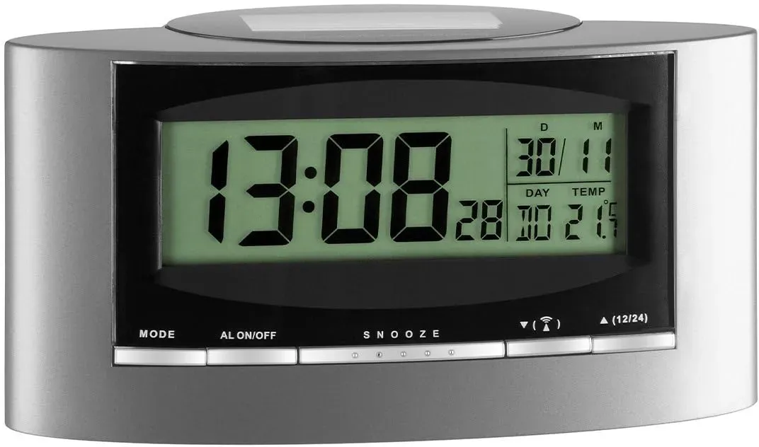 12 Händlerangebote bei billiger.de - Kategorie: Wecker - TFA - Funkuhr: Anzeige der Zeit dank Funkübertragung und Funkuhrwerk in Hoher Präzision Weckalarm: Alarm mit Snooze-Funktion für ein sanftes Aufwachen; der Wecker ist komplett solarbetrieben Display: Display mit Anzeige der aktuellen Uhrzeit, den Wochentag und die Innentemperatur Hintergrundbeleuchtung: Wecker verfügt über ein nachleuchtendes Display, somit leuchtet es nur schwach nachts und stört den Schlaf nicht Design: Durch das schlichte Design fügt sich der Funkwecker harmonisch in jede Umgebung ein - GTIN:4009816016300 ![]() ![]() TFA Dostmann Digitaler Funkwecker, 98.1071,mit Temperatur, komplett solarbetrieben, Wochentag und Datum, Temperaturanzeige, Kunststoff, Silber-schwarz, L 156 x B 52 x H 81 mm