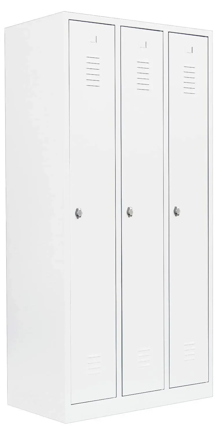 Verfügbarkeit: Gewöhnlich versandfertig in 4 bis 5 Tagen - Kategorie: Dielenmöbel - Lüllmann - GTIN:4061815856066 - Langlebige, pflegeleichte, verschweißte Stahlkonstruktion 2 Abteile, Abteilbreite ca. 400 mm Türen rechts angeschlagen, an gefederten Stiftscharnieren befestigt Türen mit Kastenverstärkung, Lüftungsschlitzen und eingestanzten Etikettenrahmen 30 x 50 mm Geräuschdämpfende Türanschlagspuffer aus Kunststoff Je Abteil Hutboden mit Garderobenstange und 3 verschiebbaren Kleiderhaken Abteilboden glatt auskehrbar S/W-Trennung Drehriegelverschluss für Vorhangschloss mit bis zu 5 mm Bügelstärke (Vorhangschloss nicht im Lieferumfang enthalten) Korpus und Türen elektrostatisch, glatt pulverbeschichtet Qualität und Sicherheit Lieferung: Komplett verschweißt - keine Montage erforderlich Maße: Höhe: 1800mm, Breite: 800mm, Tiefe: 500mm. Lieferung Frei Bordsteinkante. - 349,90 Euro bei Amazon Marketplace Home - gefunden von billiger.de Dieser 3-türige Spind ist eine solide und funktionale Wahl für Umkleidebereiche, die eine einfache und robuste Lösung benötigen. ![]() Lüllmann 3er Spind Spint Umkleide Stahl Kleiderschränke Gaderobenschrank 3 türiger 510131